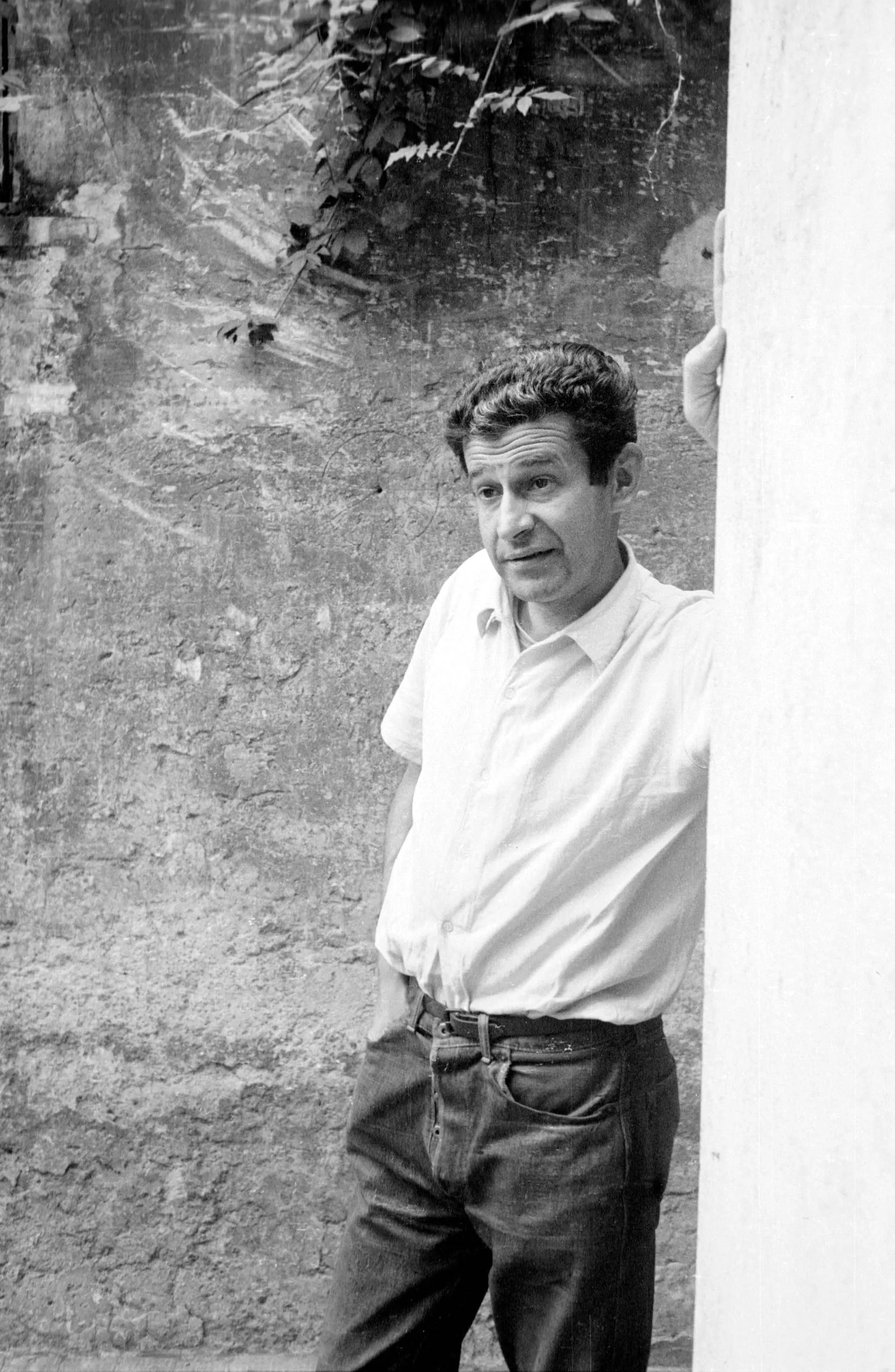 Black and white photograph of a man from the knees up, leaning against a white wall outdoors, wearing a white short-sleeved shirt and dark jeans, looking directly at the camera