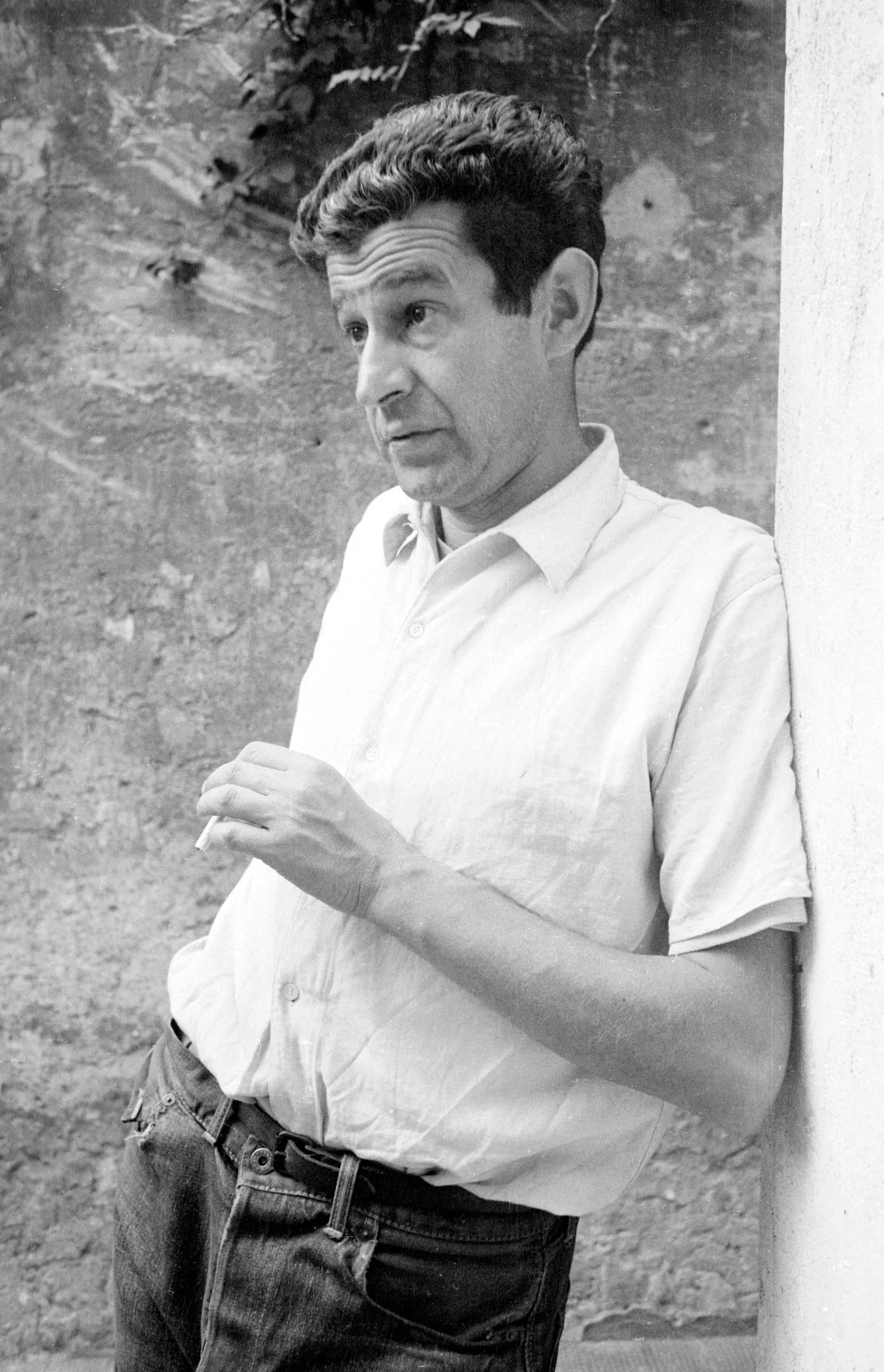 Black and white photograph, man from the hips up in a white short-sleeved shirt and dark jeans, leaning against a white wall, looking to one side