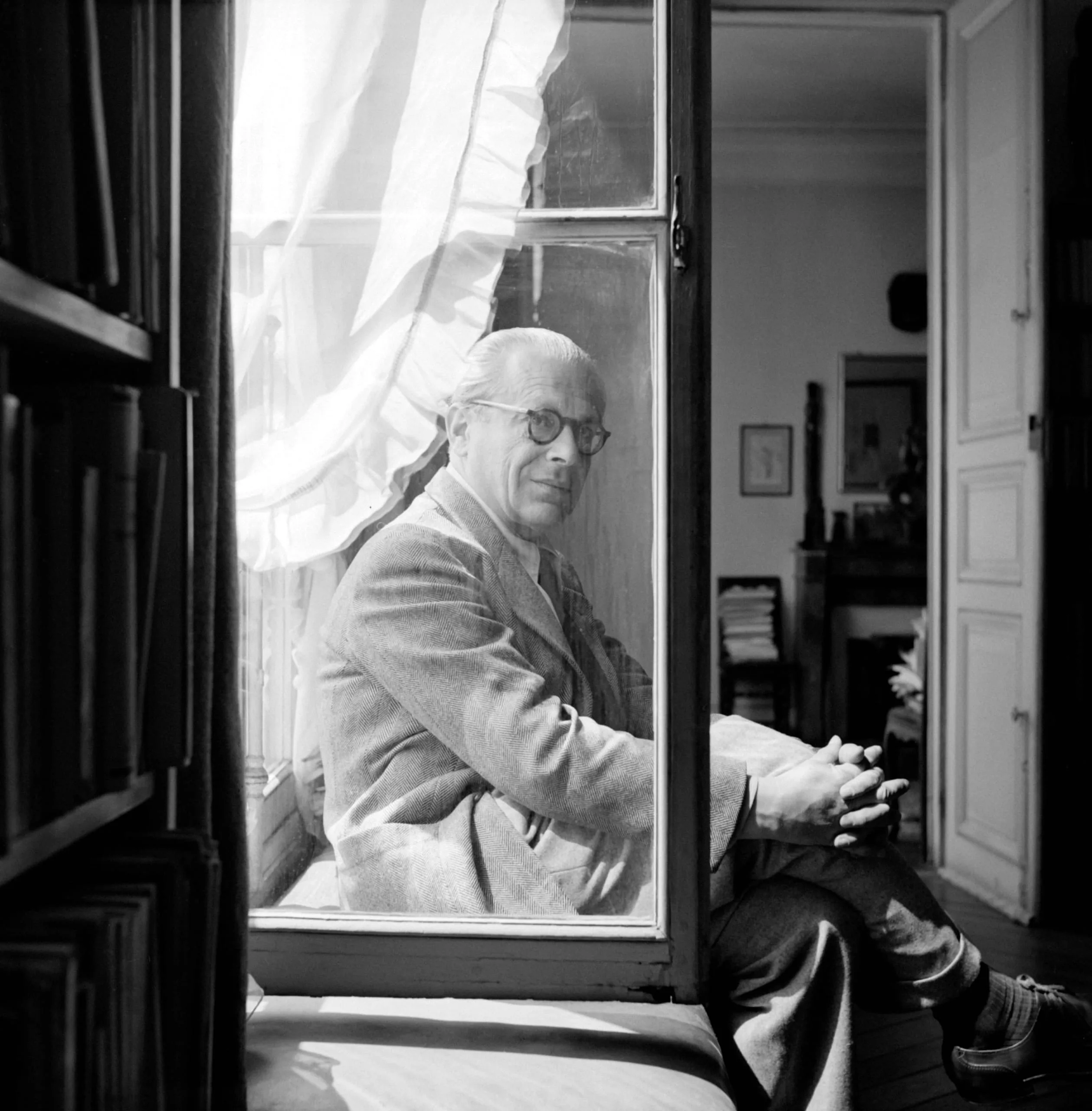 Black and white photograph of a man in a tweed jacket and round glasses sitting in an open casement window, hands clasped, looking toward the camera