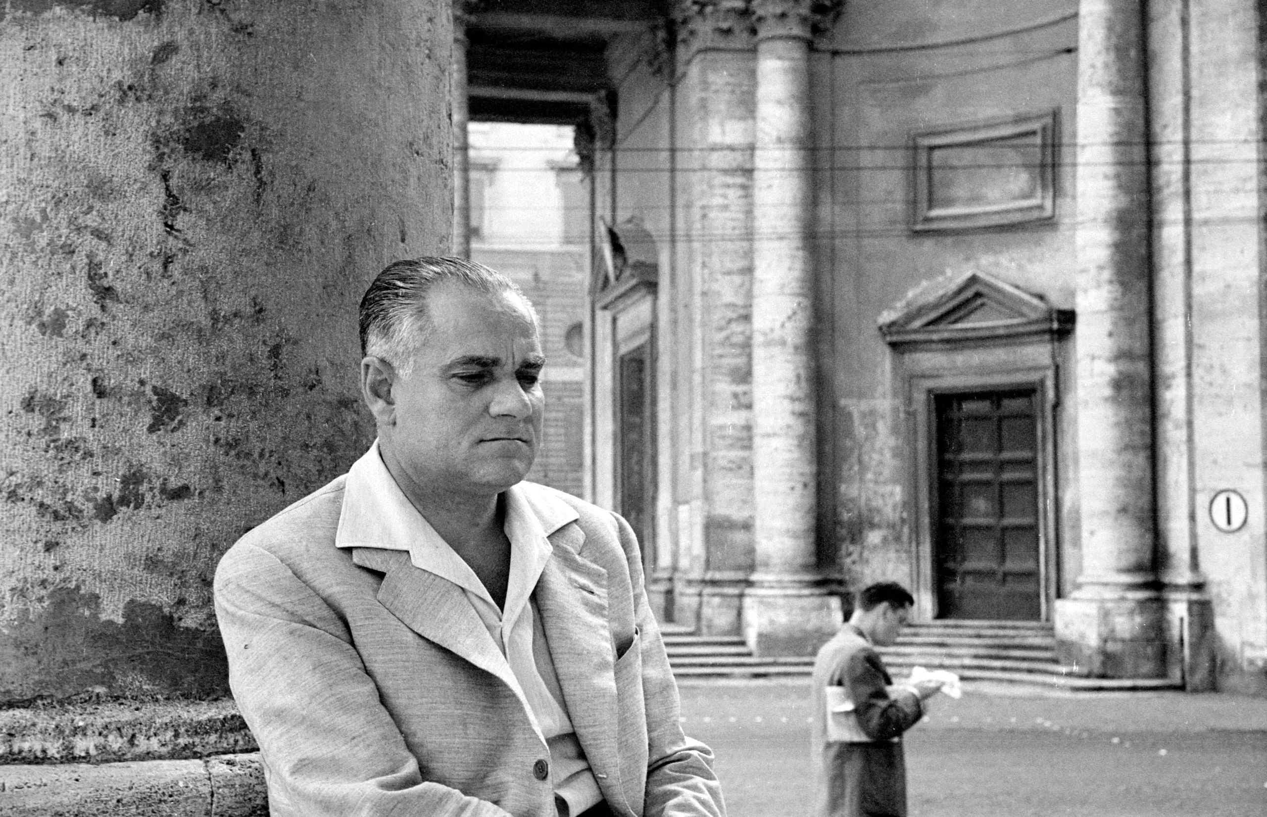 Black and white photograph of a heavyset man in a blazer leaning against a worn stone column, with a classical colonnaded building and a second figure visible in the distance