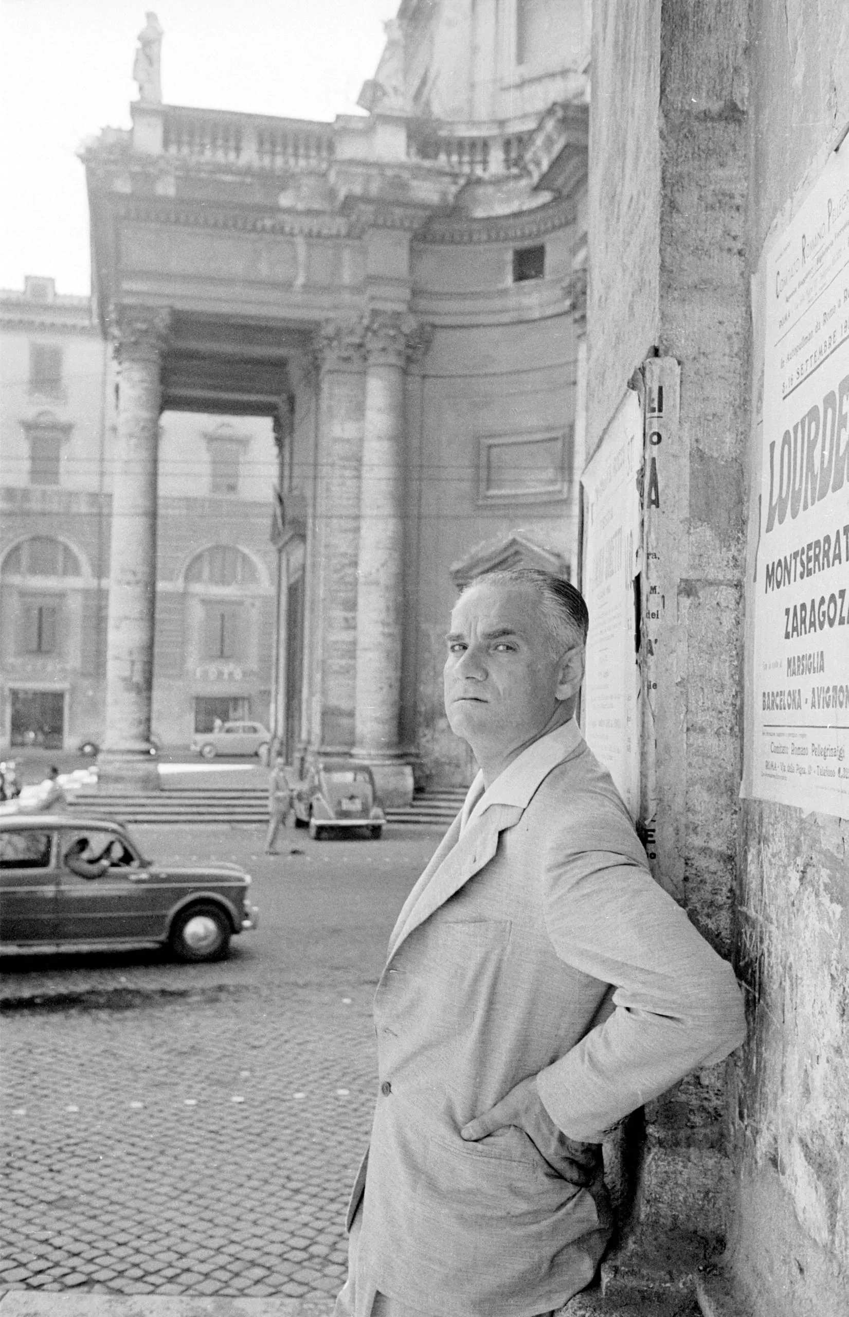 Black and white photograph of a man in a suit jacket leaning against a wall, a Baroque colonnade and cobblestone piazza visible behind him