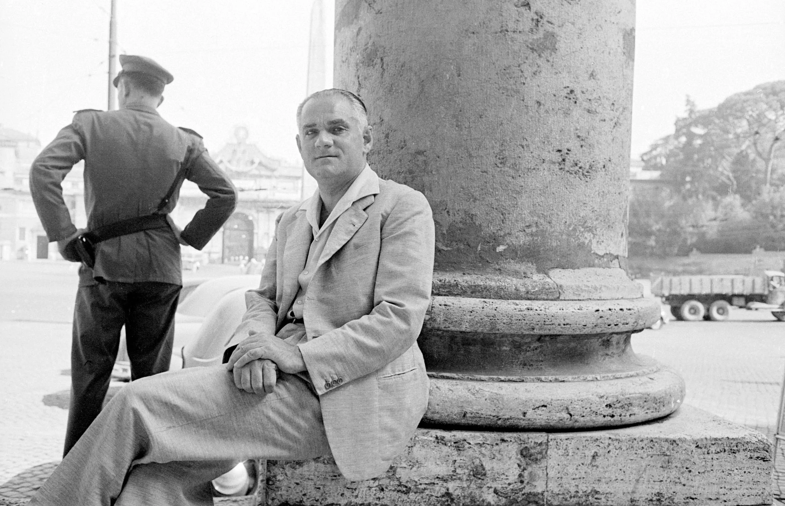 Black and white photograph of a white man in a light suit seated at the base of a large stone column in an outdoor plaza, with a uniformed officer standing in the background
