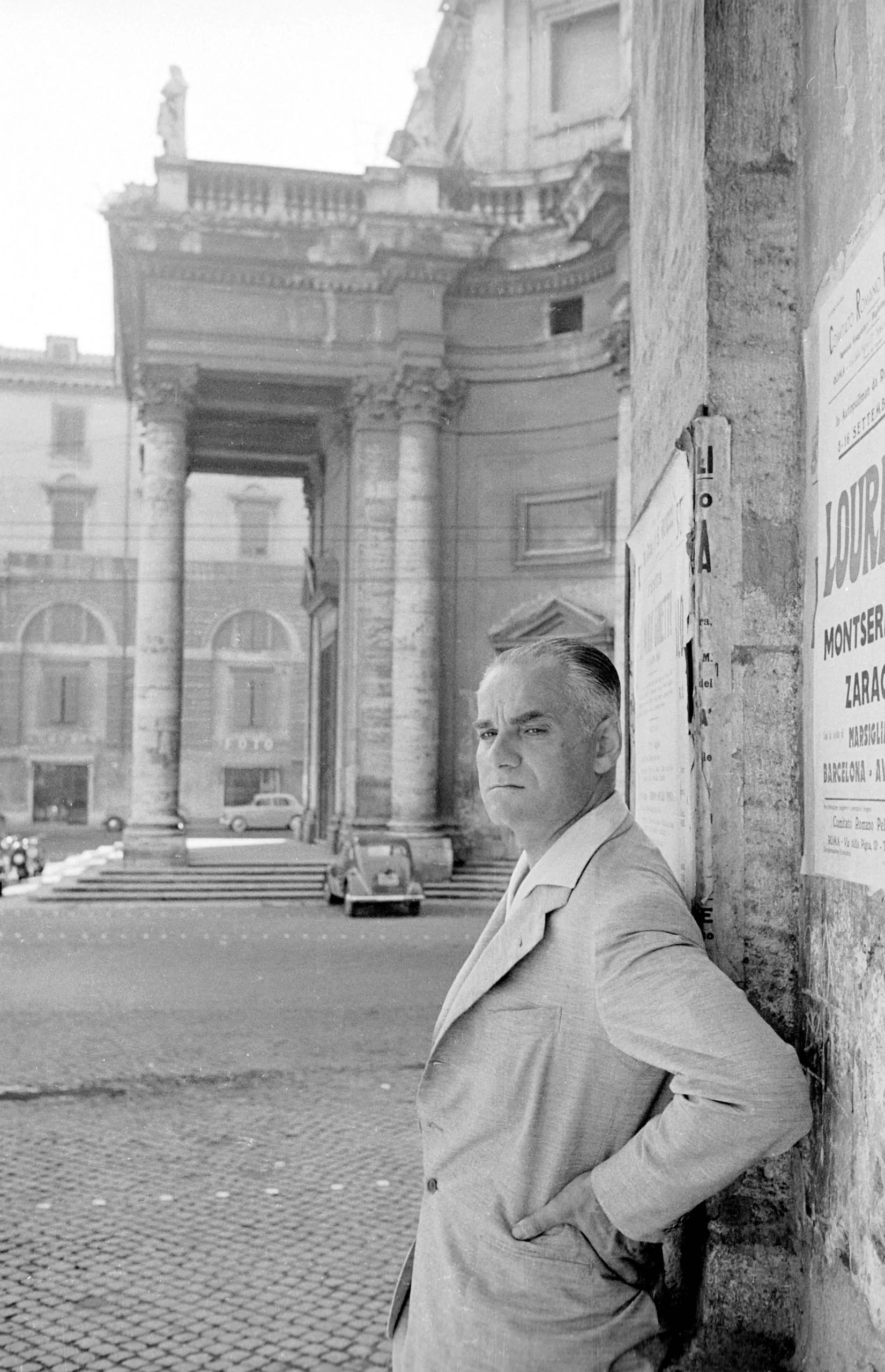 Black and white photograph of a heavyset man in a light suit leaning against a wall, with a monumental Baroque colonnade and piazza visible behind him