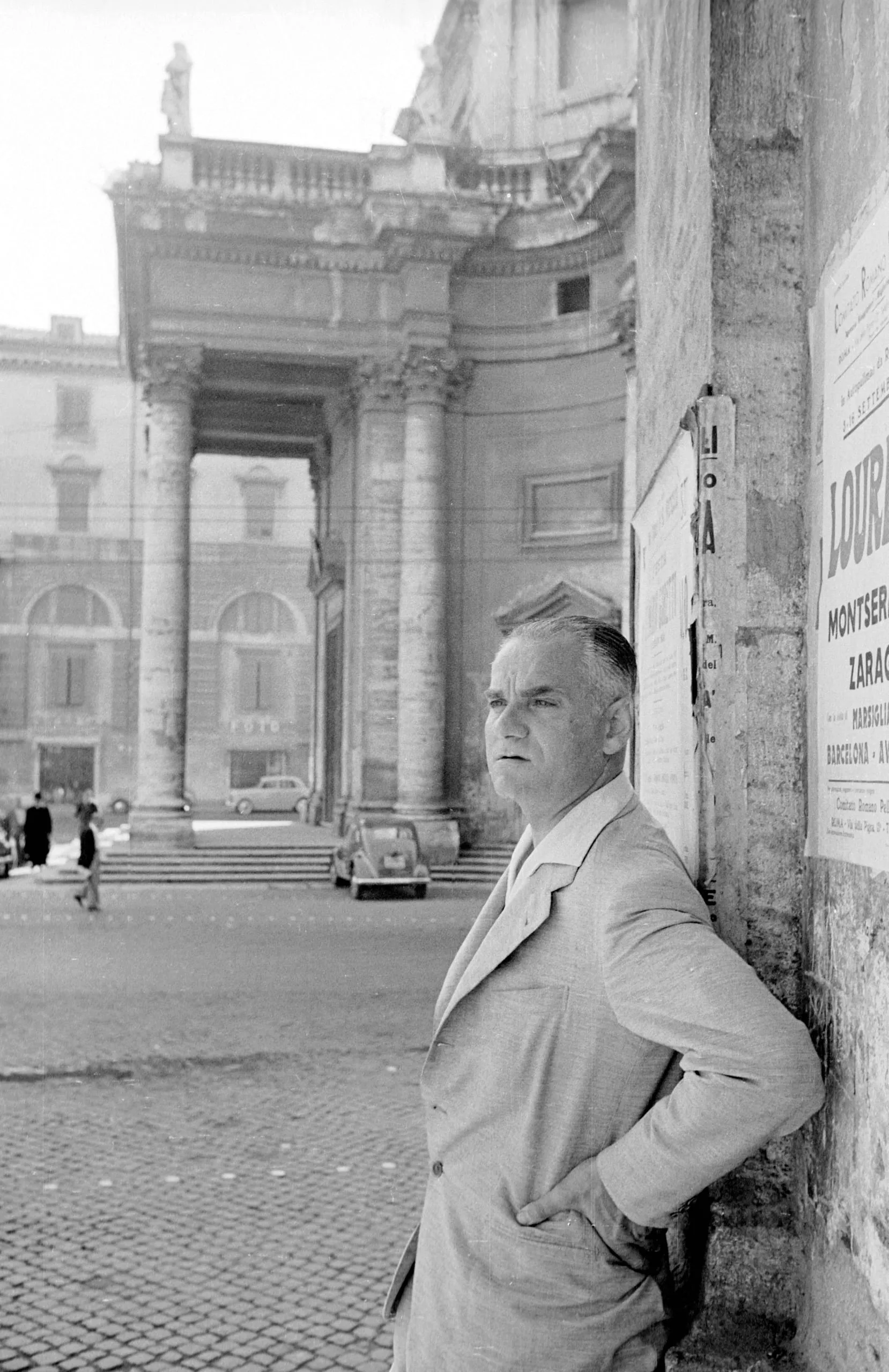 Black and white photograph, heavyset man in a light suit leans against a stone wall in profile, columned classical facade and open plaza visible behind him