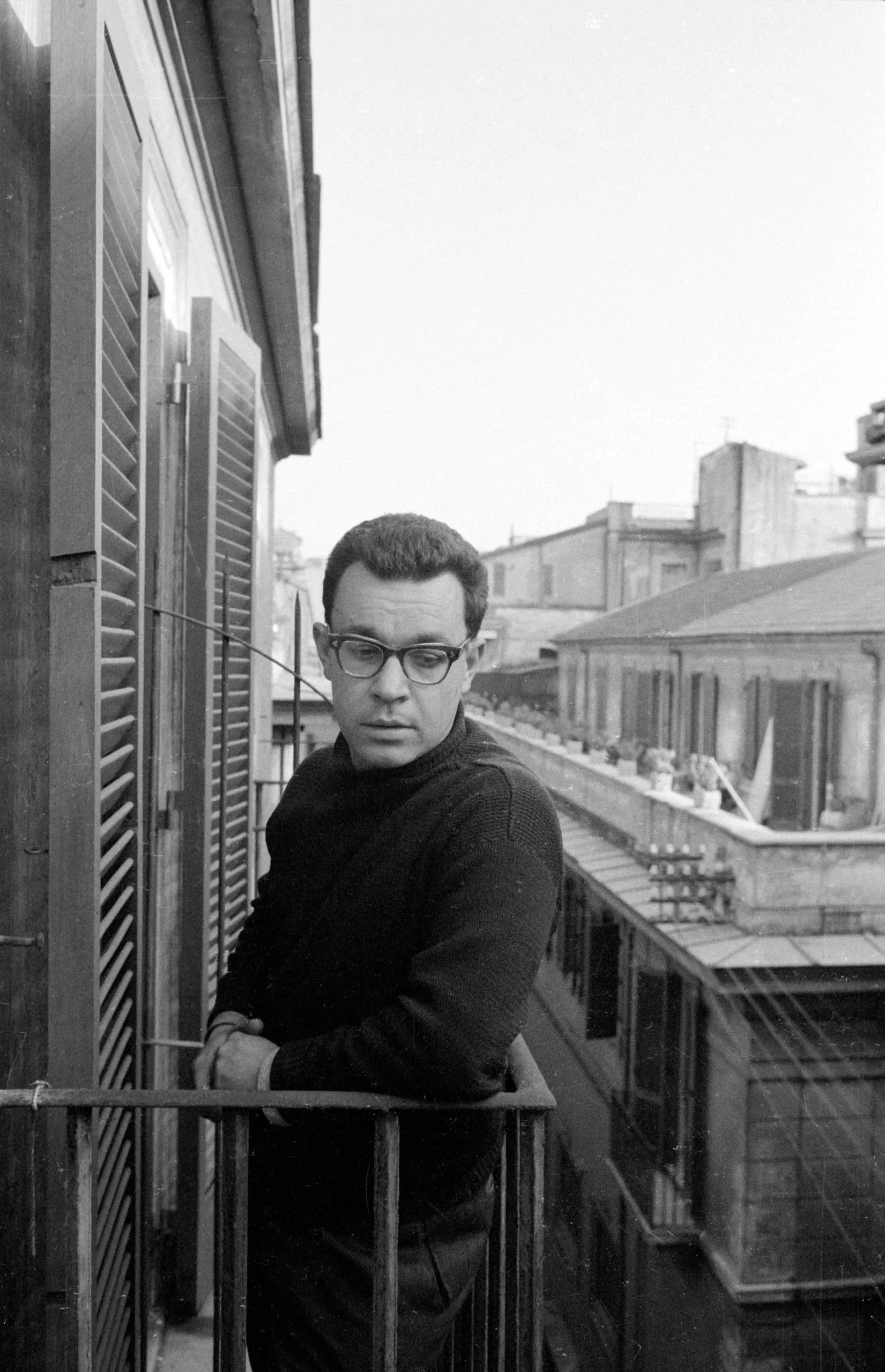 Black and white photograph, white man in dark crewneck sweater and glasses leaning on a balcony railing, urban rooftops behind him