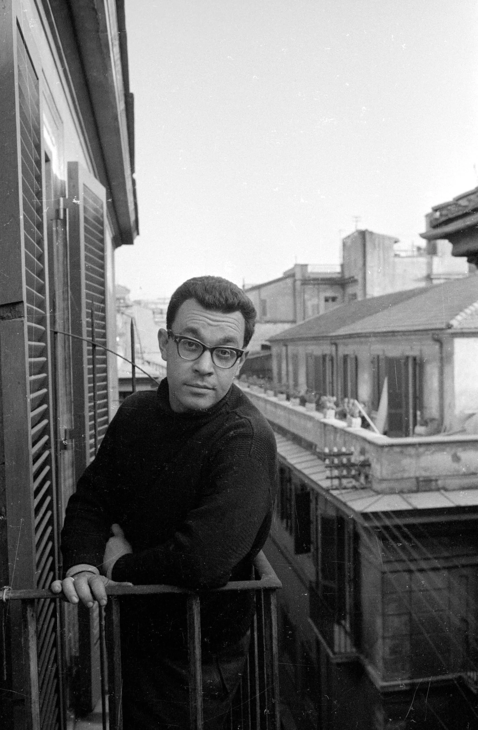 Black and white photograph of a white man with dark-framed glasses leaning on a balcony railing, rooftop cityscape behind him