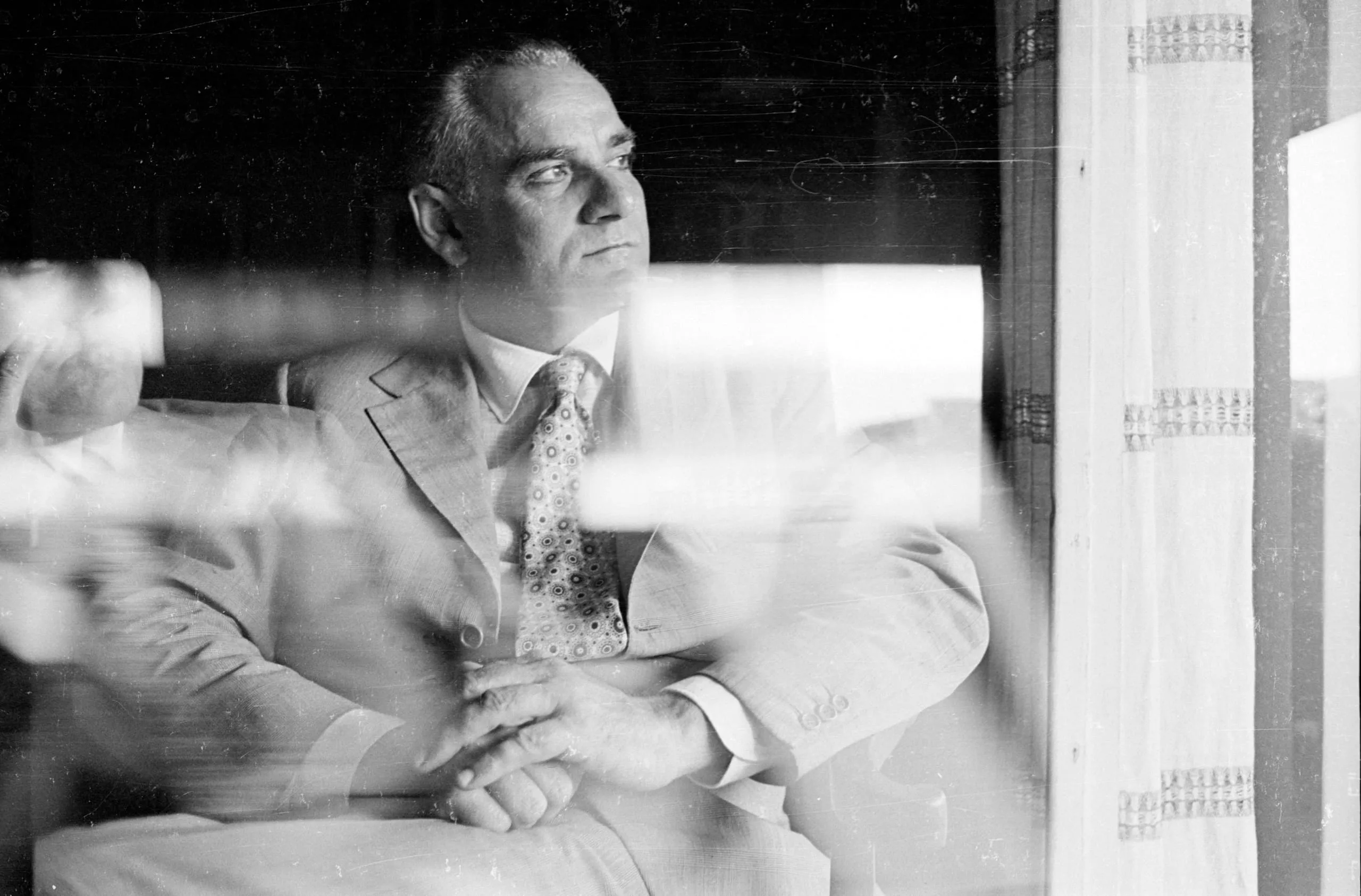 Black and white photograph of a man in a suit and tie, arms crossed, photographed through a glass pane with reflections, looking to the right in near-profile