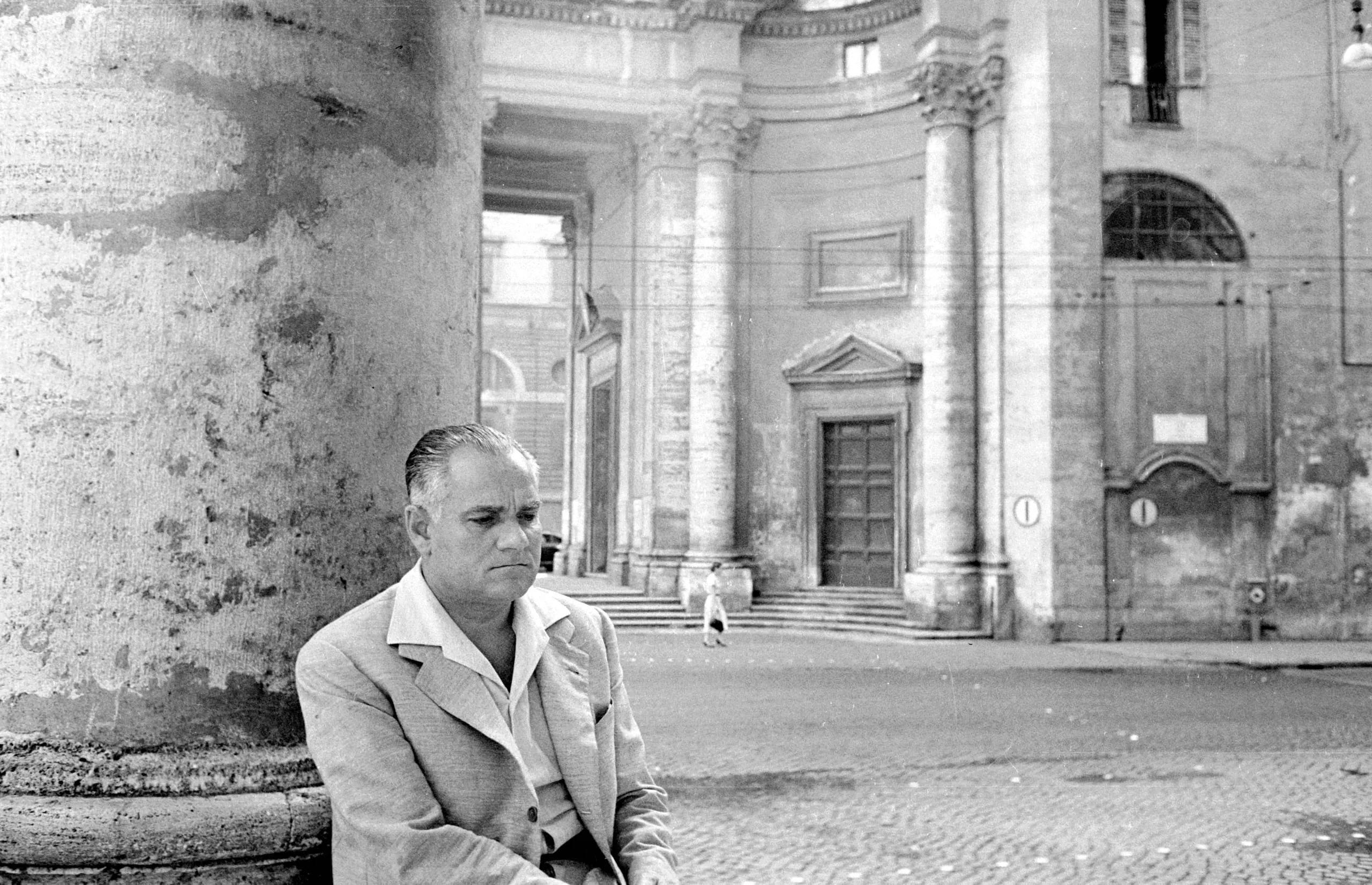Black and white photograph of a middle-aged man in a blazer seated against a weathered stone column, a Baroque church facade visible behind him across a cobblestone piazza