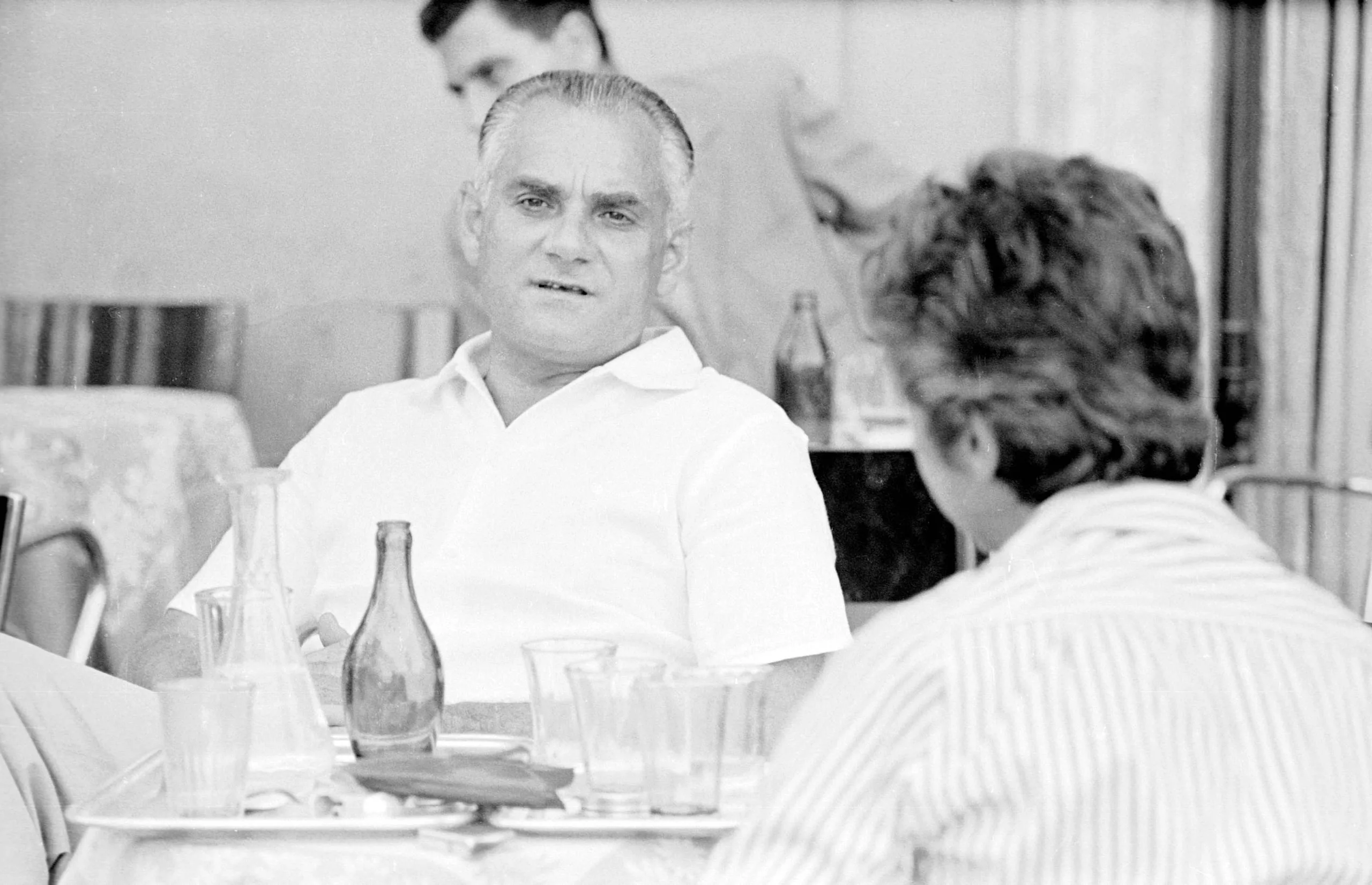 Black and white photograph of two men seated at a table with glasses and bottles, one facing the camera in a white short-sleeved shirt, third figure standing in background