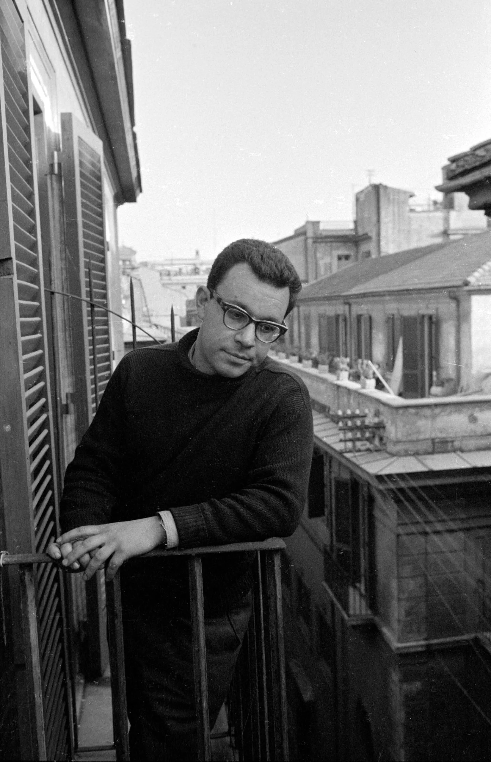 Black and white photograph of a white man in dark-framed glasses and a crew-neck sweater, leaning on a balcony railing with rooftops visible behind him