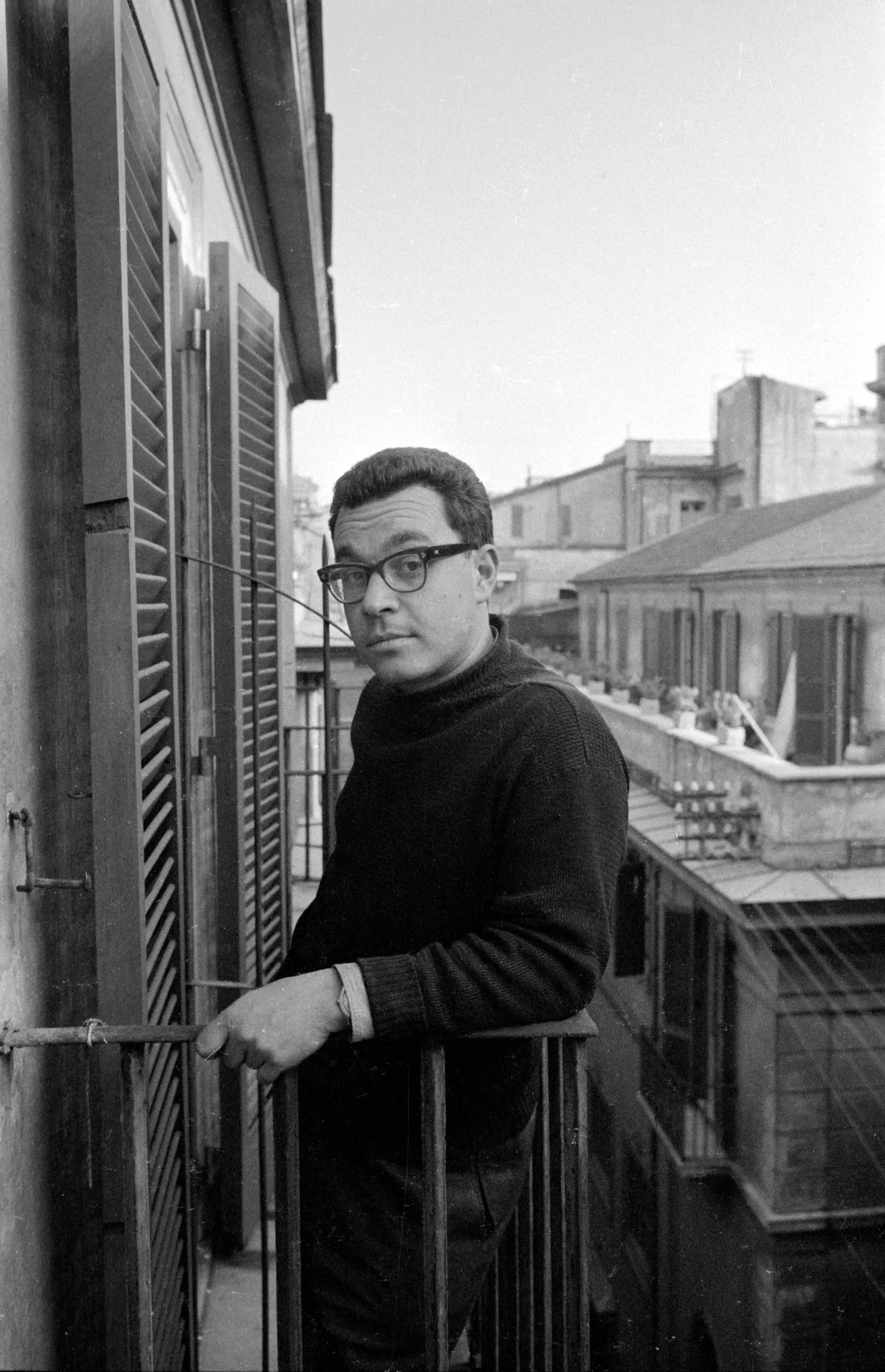 Black and white photograph of a man in a dark turtleneck and thick-framed glasses standing on a balcony, gripping a metal railing, with a rooftop cityscape behind him