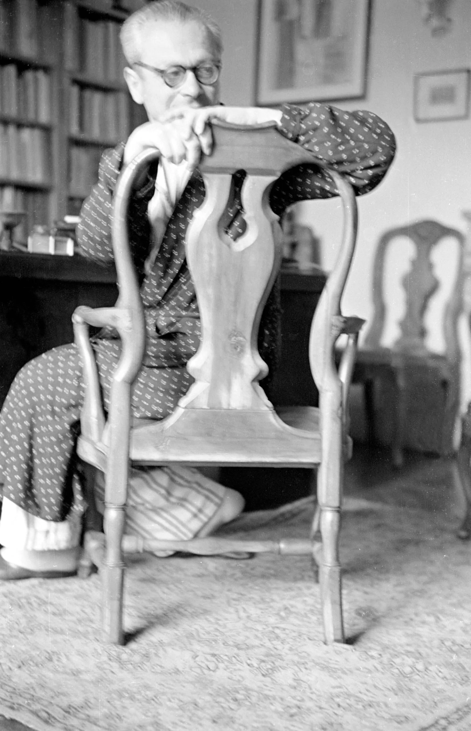 Black and white photograph of a man in a patterned robe seated backwards on a wooden chair with a vase-shaped splat, chin resting on folded arms, bookshelves in background