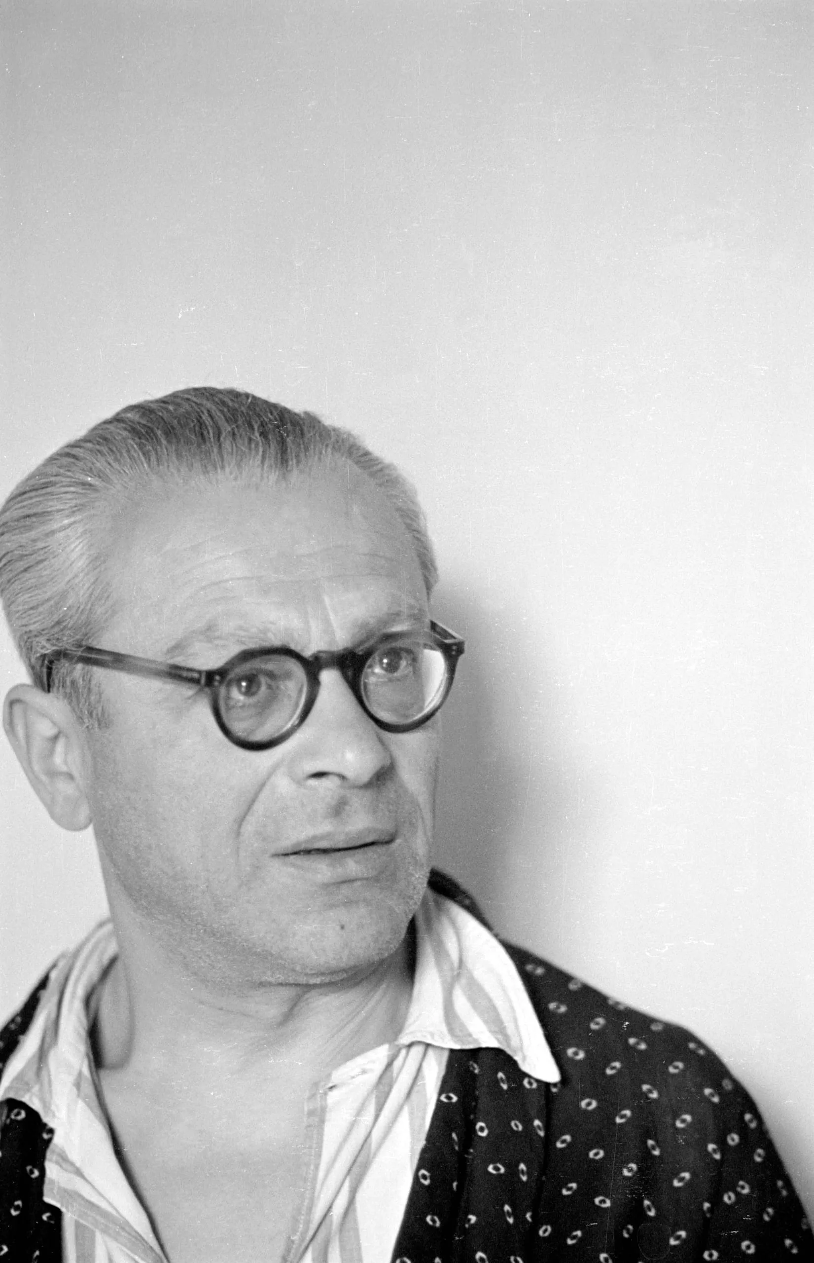 Black and white portrait photograph, white man in three-quarter profile looking right, wearing round tortoiseshell glasses and a patterned open-collar shirt