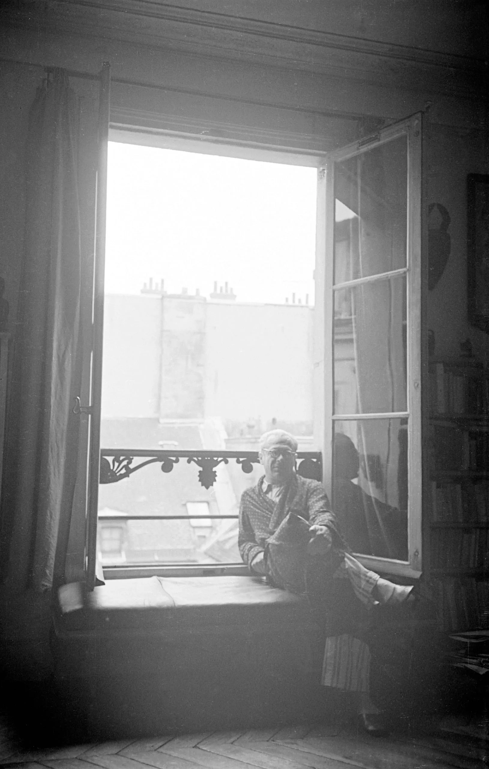 Black and white photograph of a man seated on a window ledge, backlit by bright daylight, with Parisian rooftops visible behind him