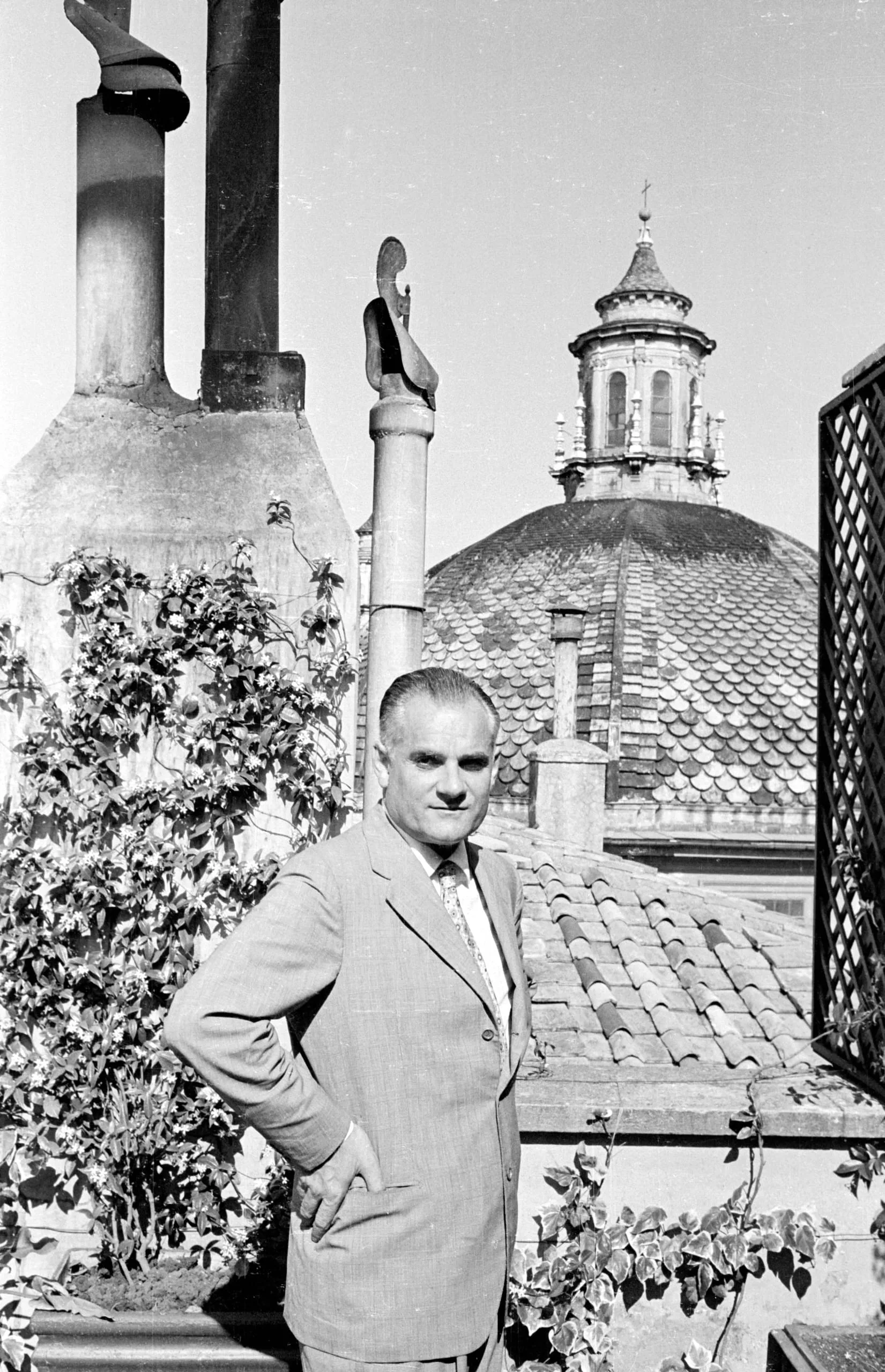 Black and white photograph, waist-up portrait of a man in a light suit standing on a rooftop terrace with a domed church tower visible behind him