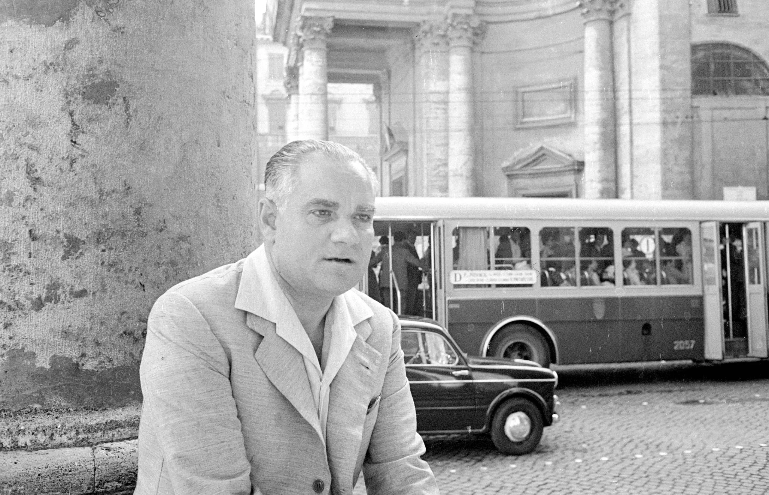 Black and white photograph, waist-up portrait of a man in a light sport coat against a stone column, with a mid-century bus and classical building behind him