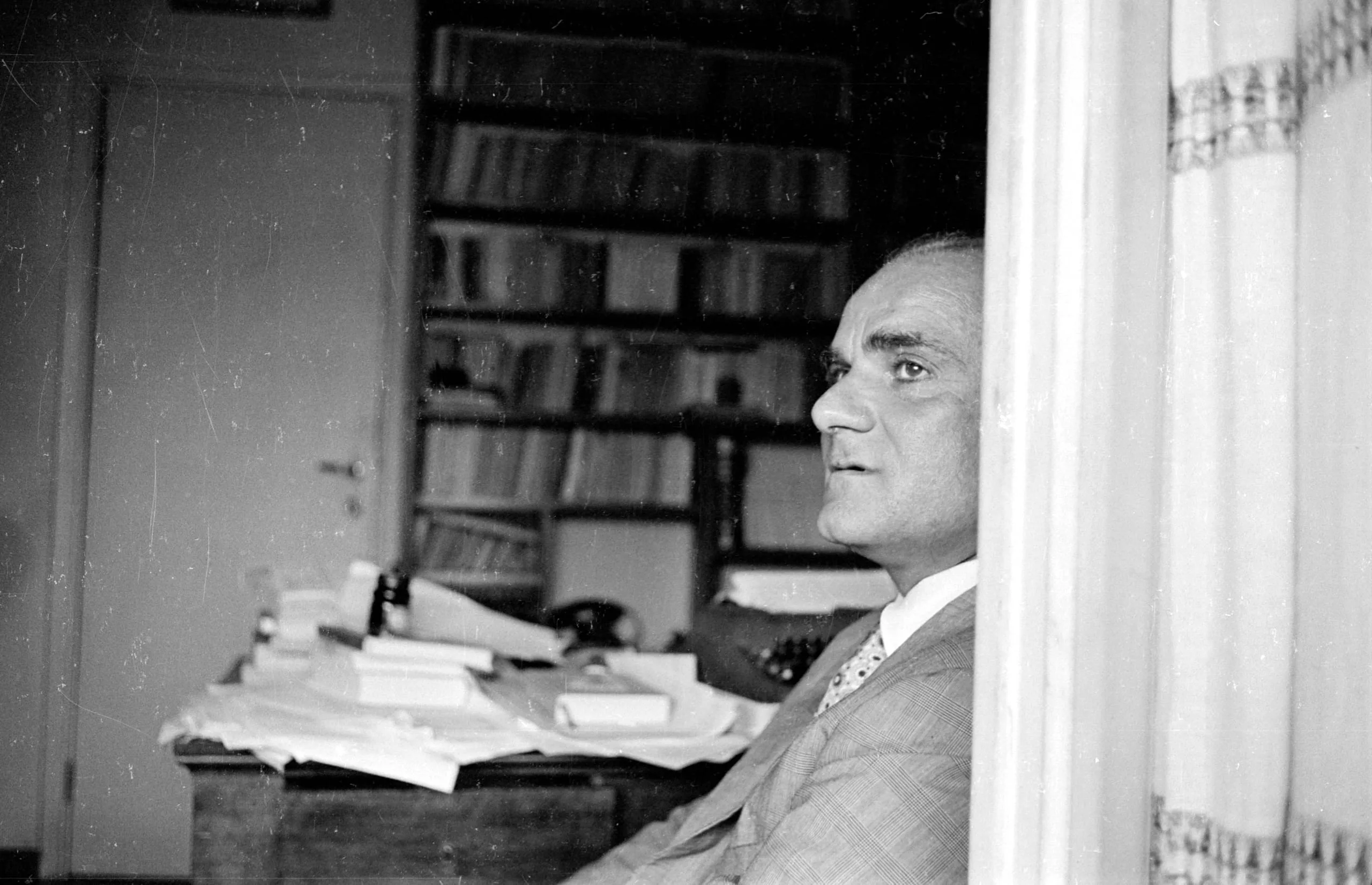 Black and white photograph of a man in profile facing left, wearing a plaid blazer, seated before a desk piled with books and papers, bookshelves in the background