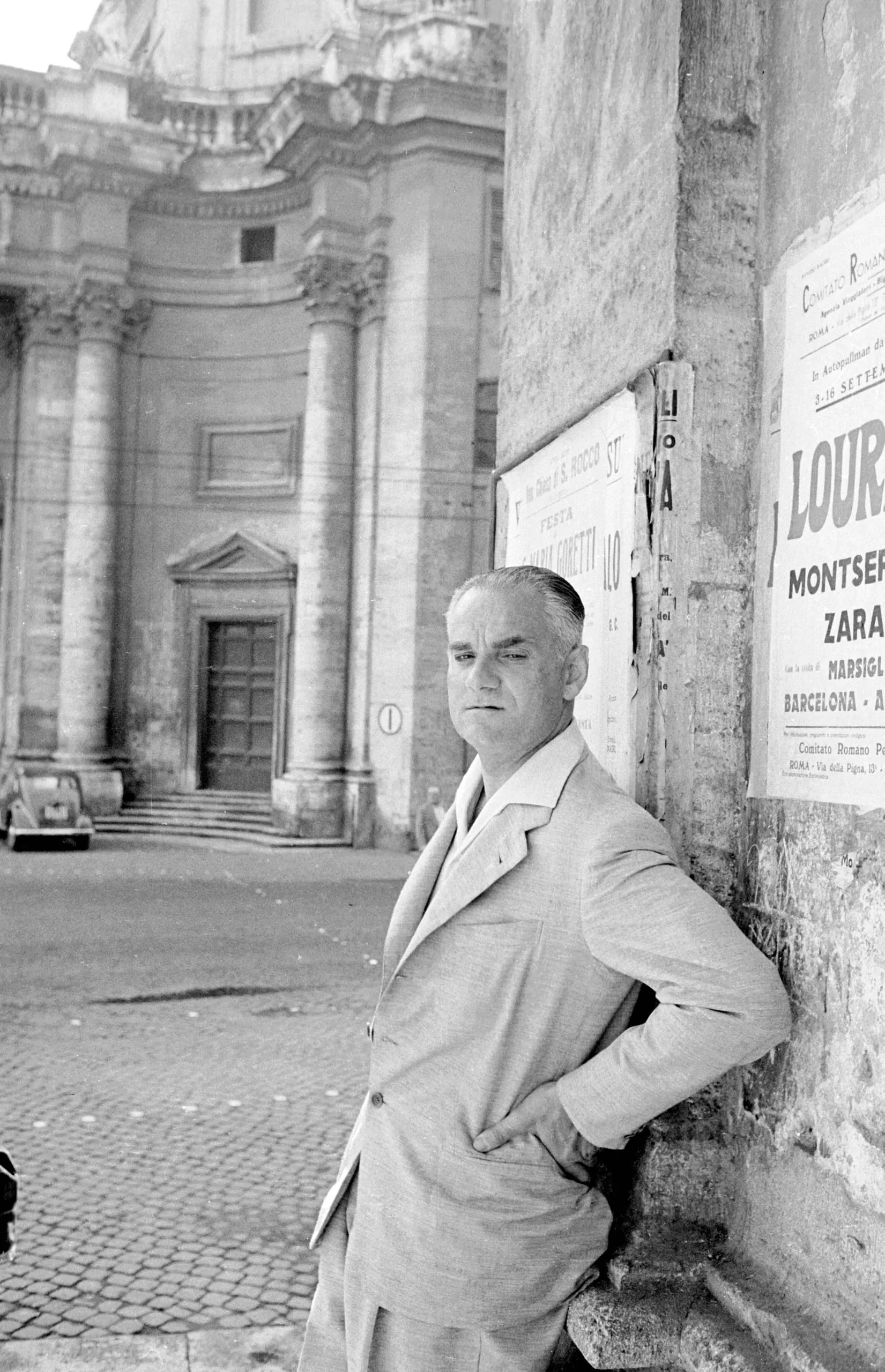 Black and white photograph of a heavyset man in a light suit standing with hands on hips before a stone wall with posted Italian bills, a Baroque church visible in the background