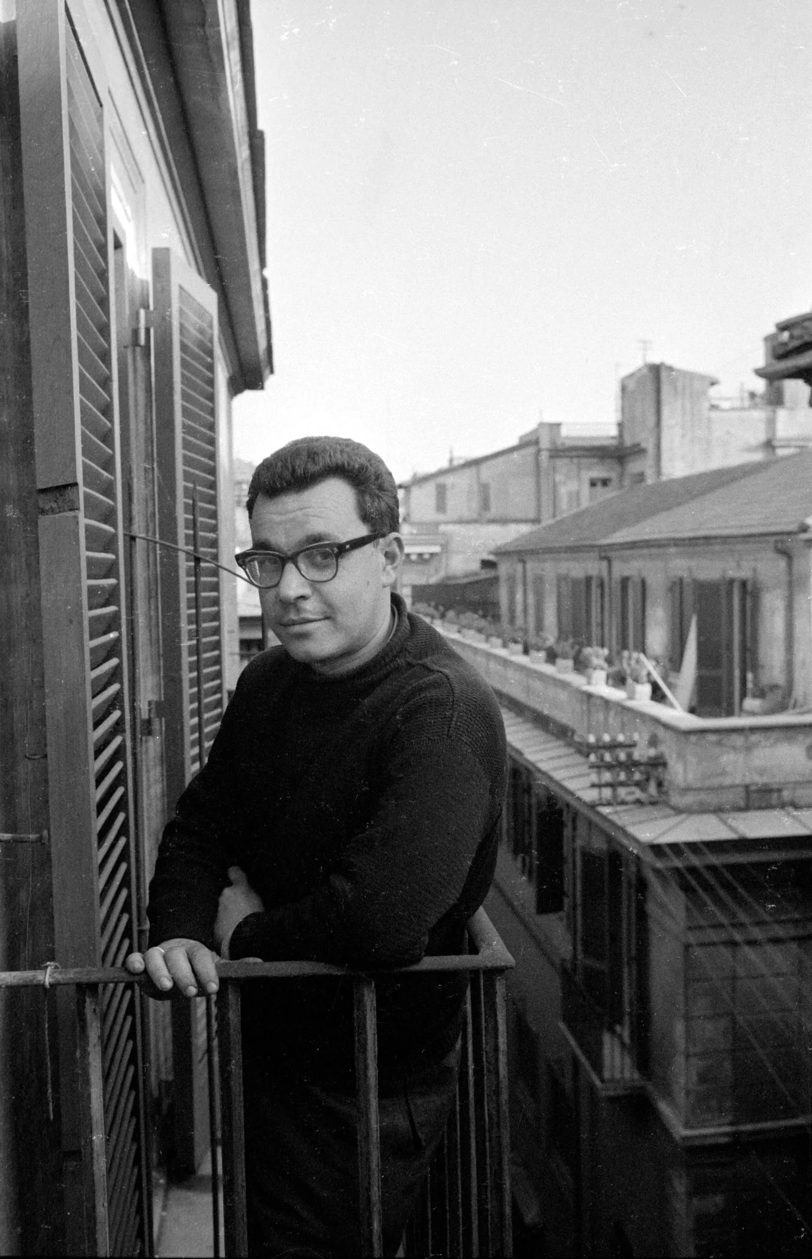 Black and white photograph of a man in a dark knit sweater leaning on an iron balcony railing, wearing cat-eye glasses, urban rooftops behind him