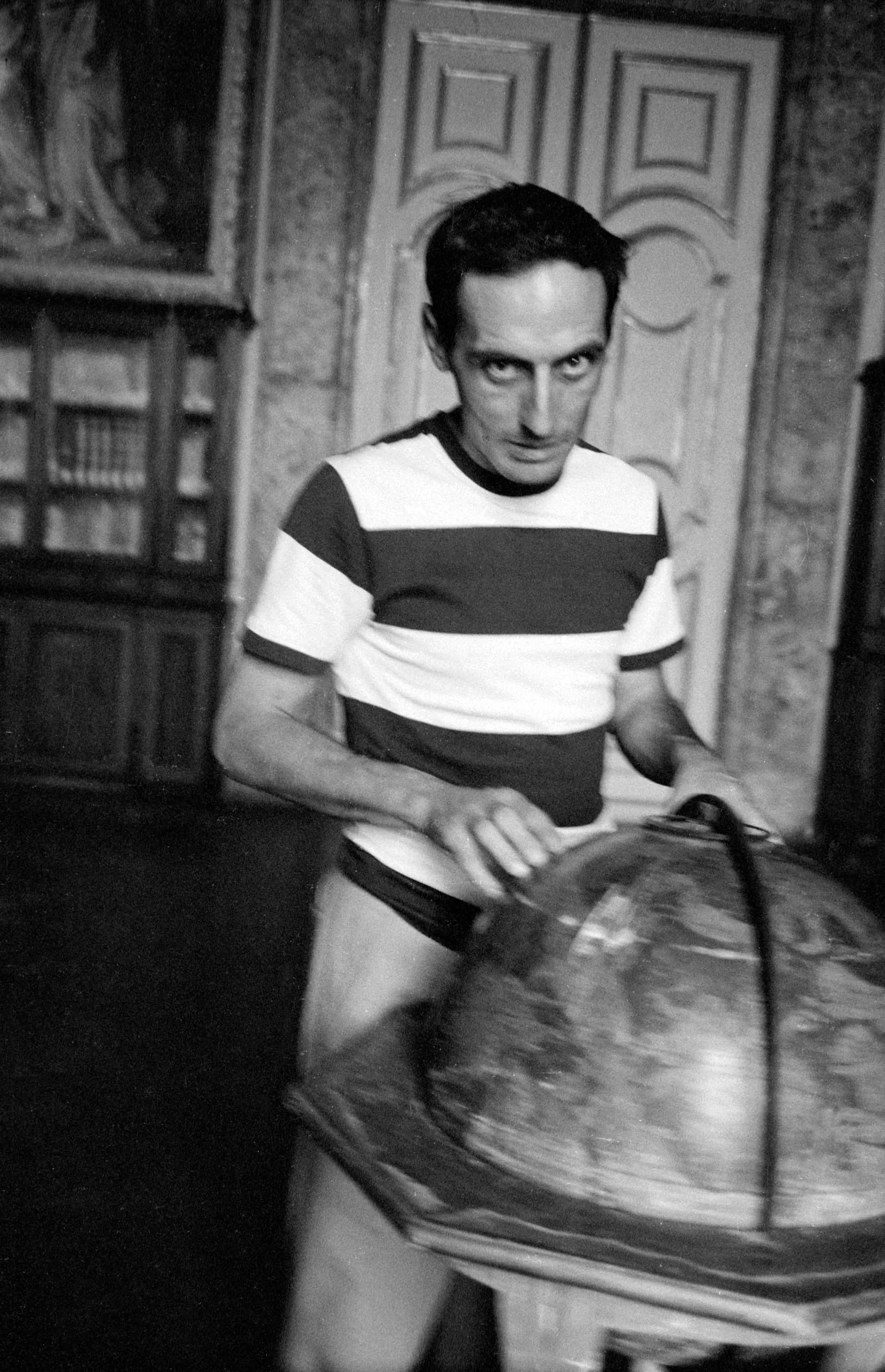 Black and white photograph of a lean man in a striped short-sleeved shirt leaning over a large floor globe, looking directly at the camera