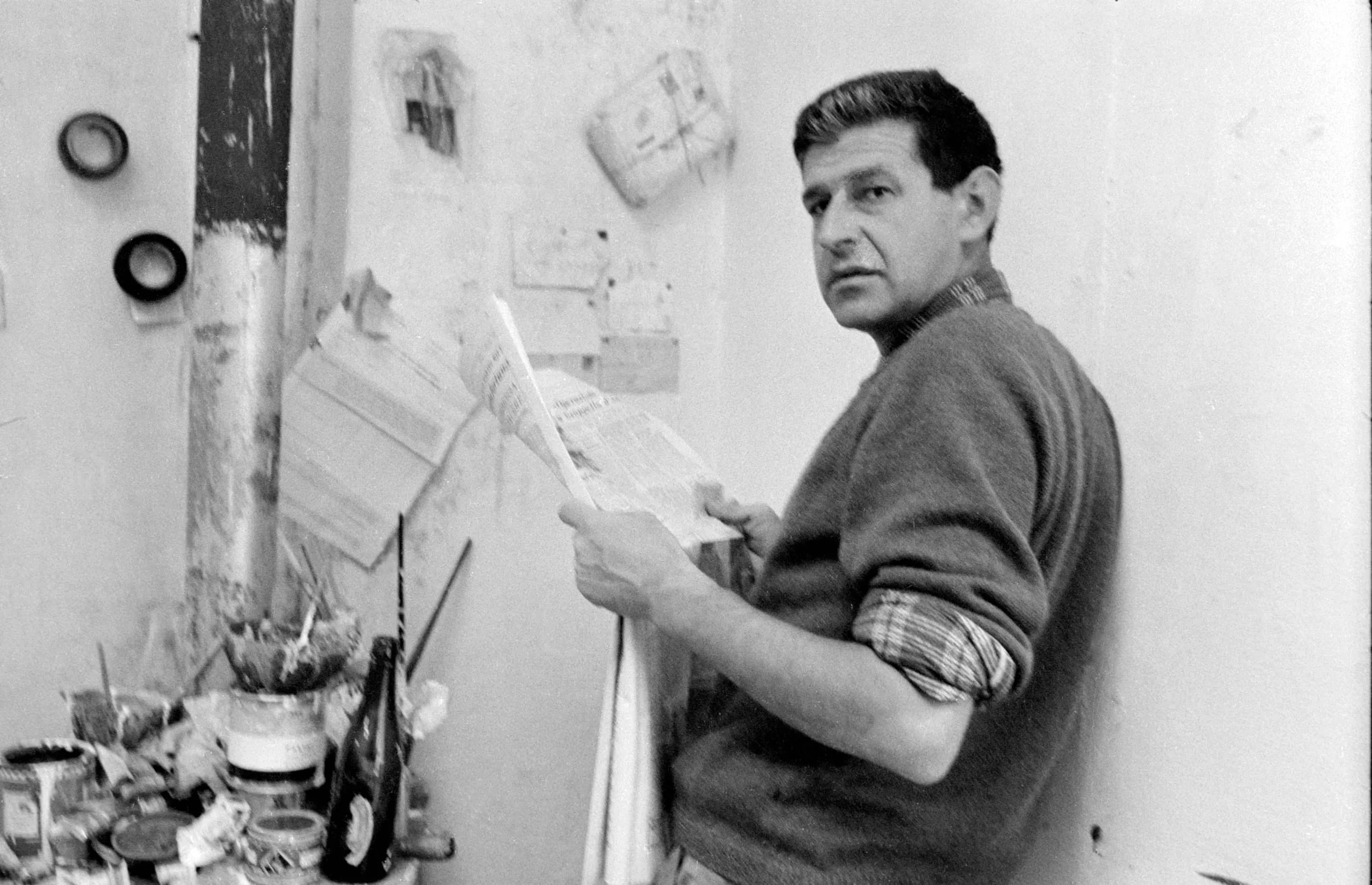 Black and white photograph of a man in a sweater holding a newspaper, standing against a cluttered studio wall, looking back over his shoulder toward the camera