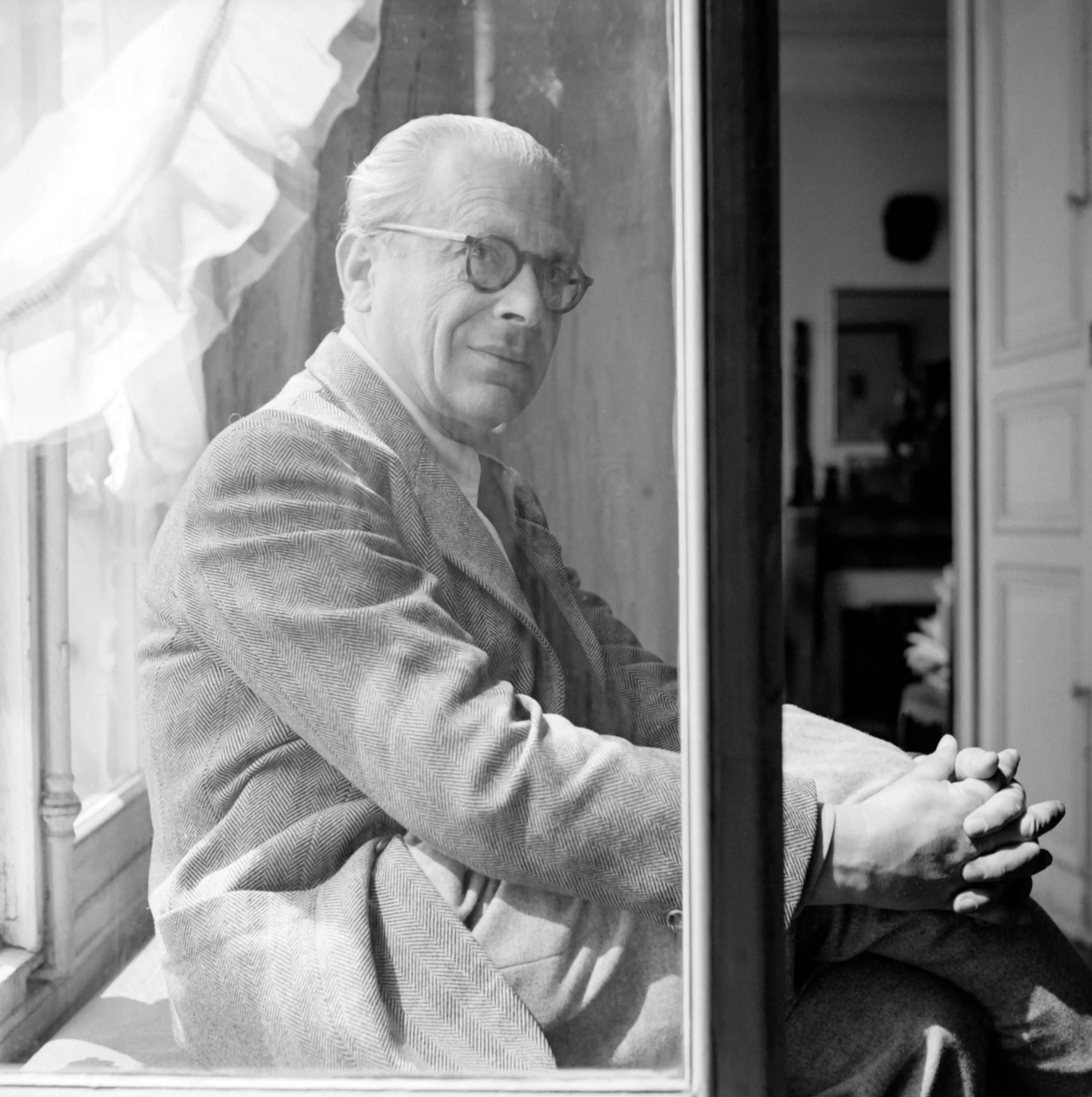 Black and white photograph of an older white man in a herringbone sport coat, seated beside an open window with a billowing curtain, hands clasped, looking at the camera