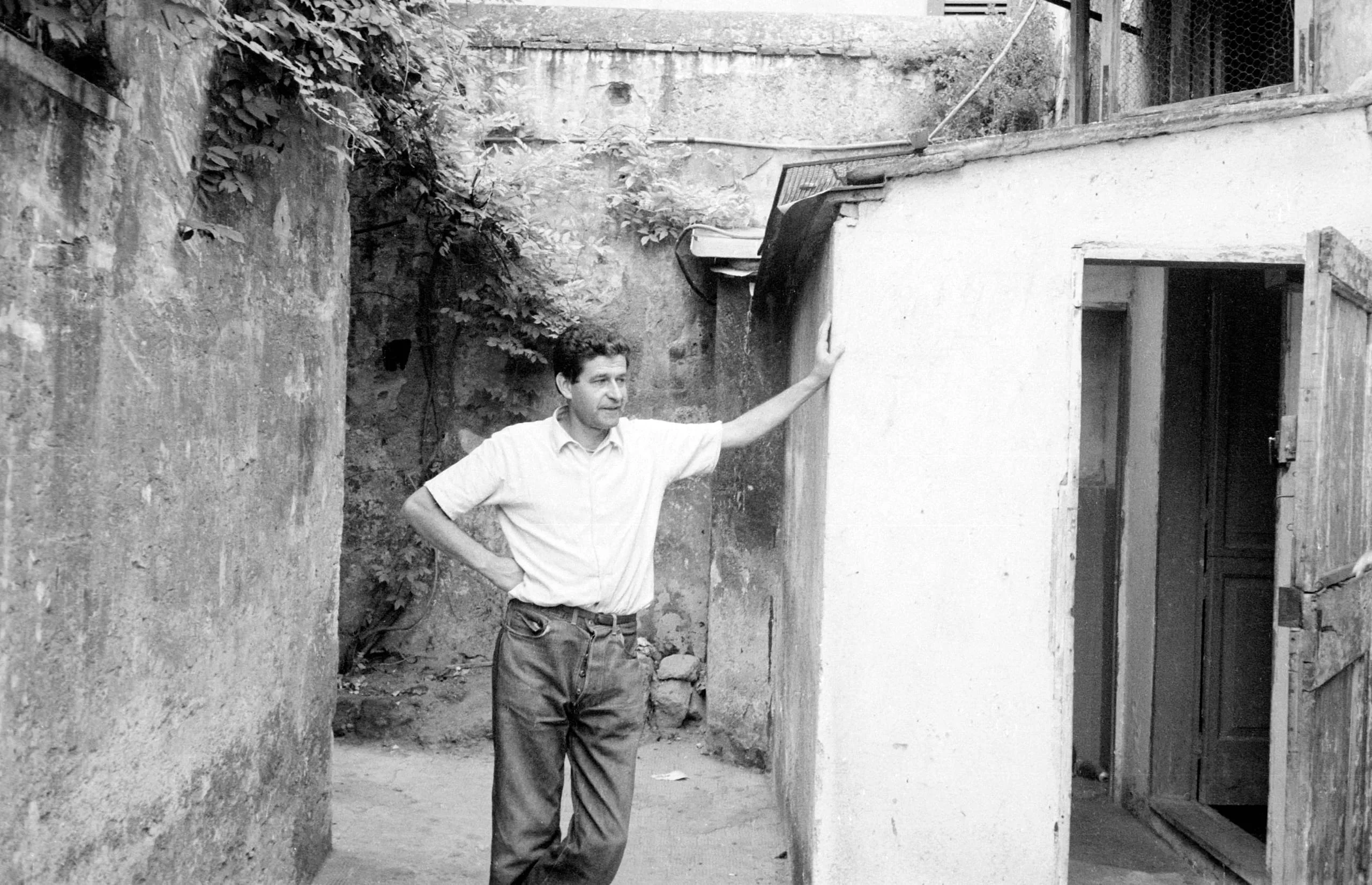 Black and white photograph of a man in a short-sleeved shirt and dark trousers leaning against a white wall in a narrow outdoor passageway between weathered stone buildings