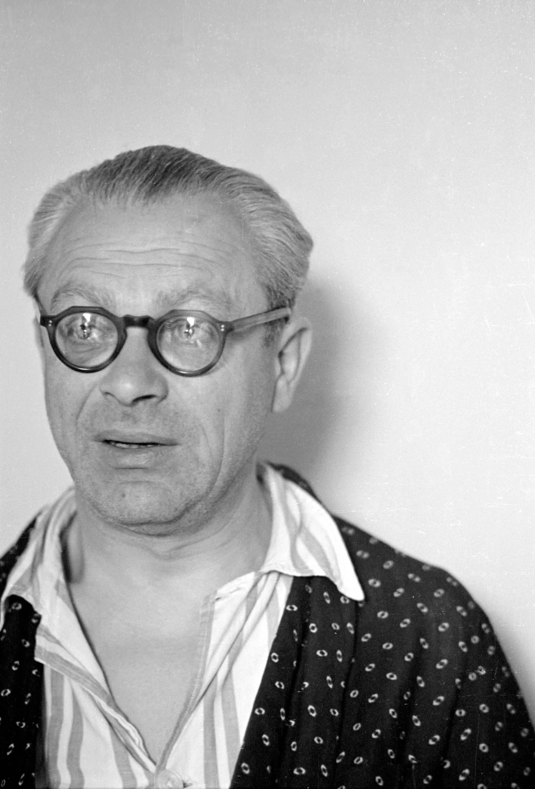 Black and white portrait photograph, man from the chest up, wearing round dark-framed glasses and an open-collared patterned shirt over a striped shirt