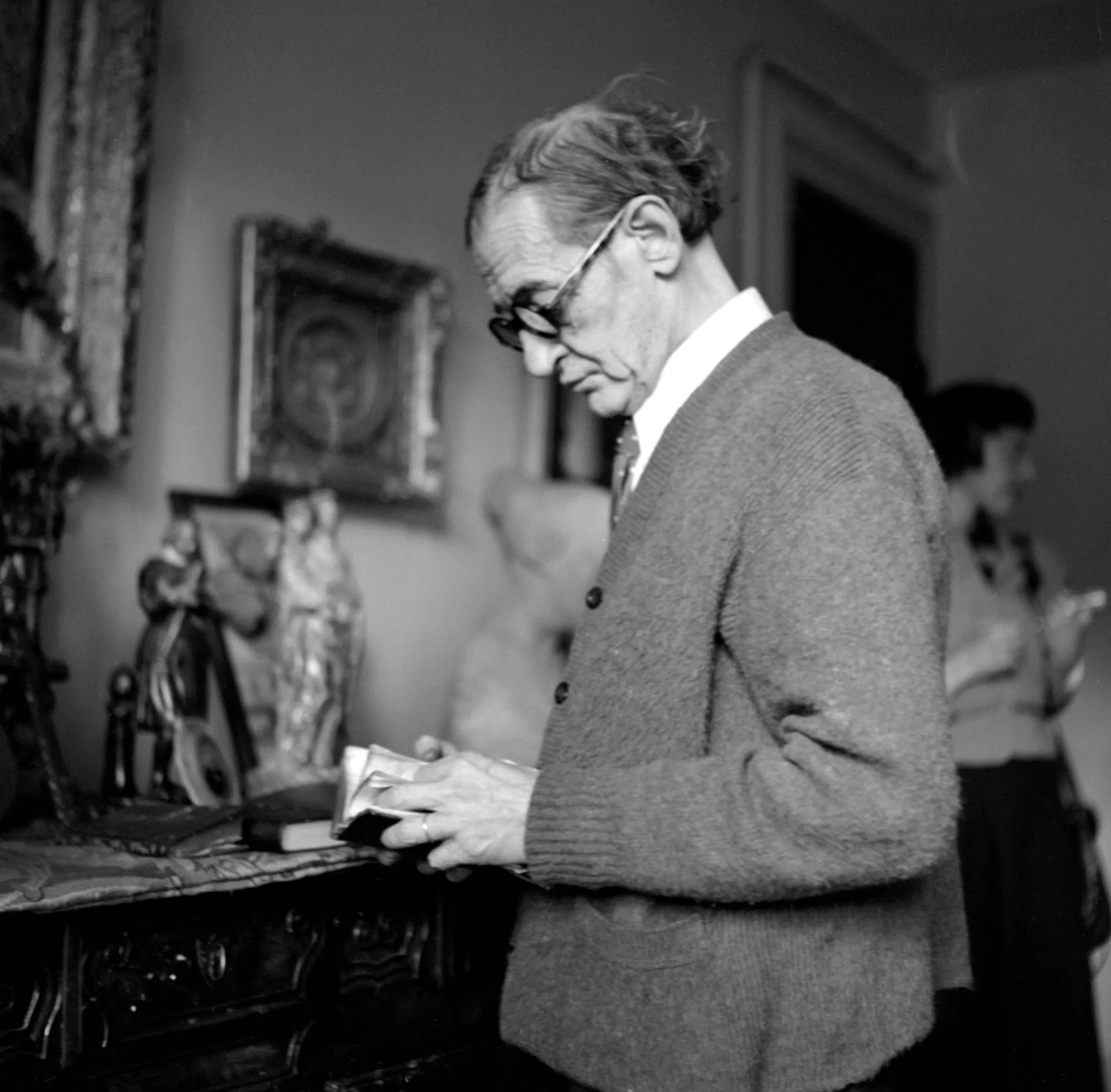 Black and white photograph of an older white man in profile, wearing glasses and a cardigan, looking down at a small object held in both hands, with decorative objects and framed artwork visible in the background