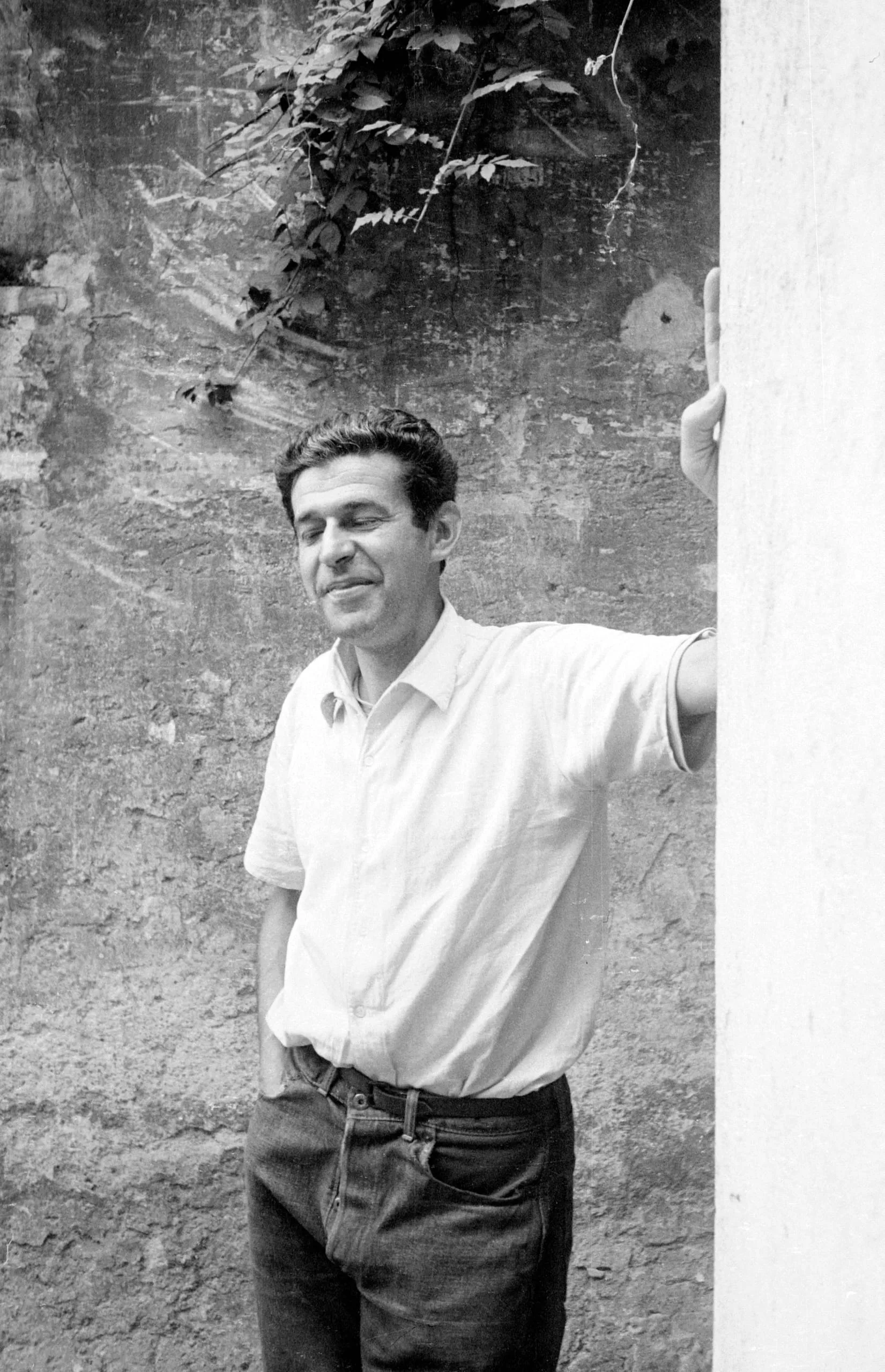 Black and white photograph of a man from the hips up, leaning against a white wall outdoors, head tilted down, wearing a light short-sleeved shirt and dark trousers
