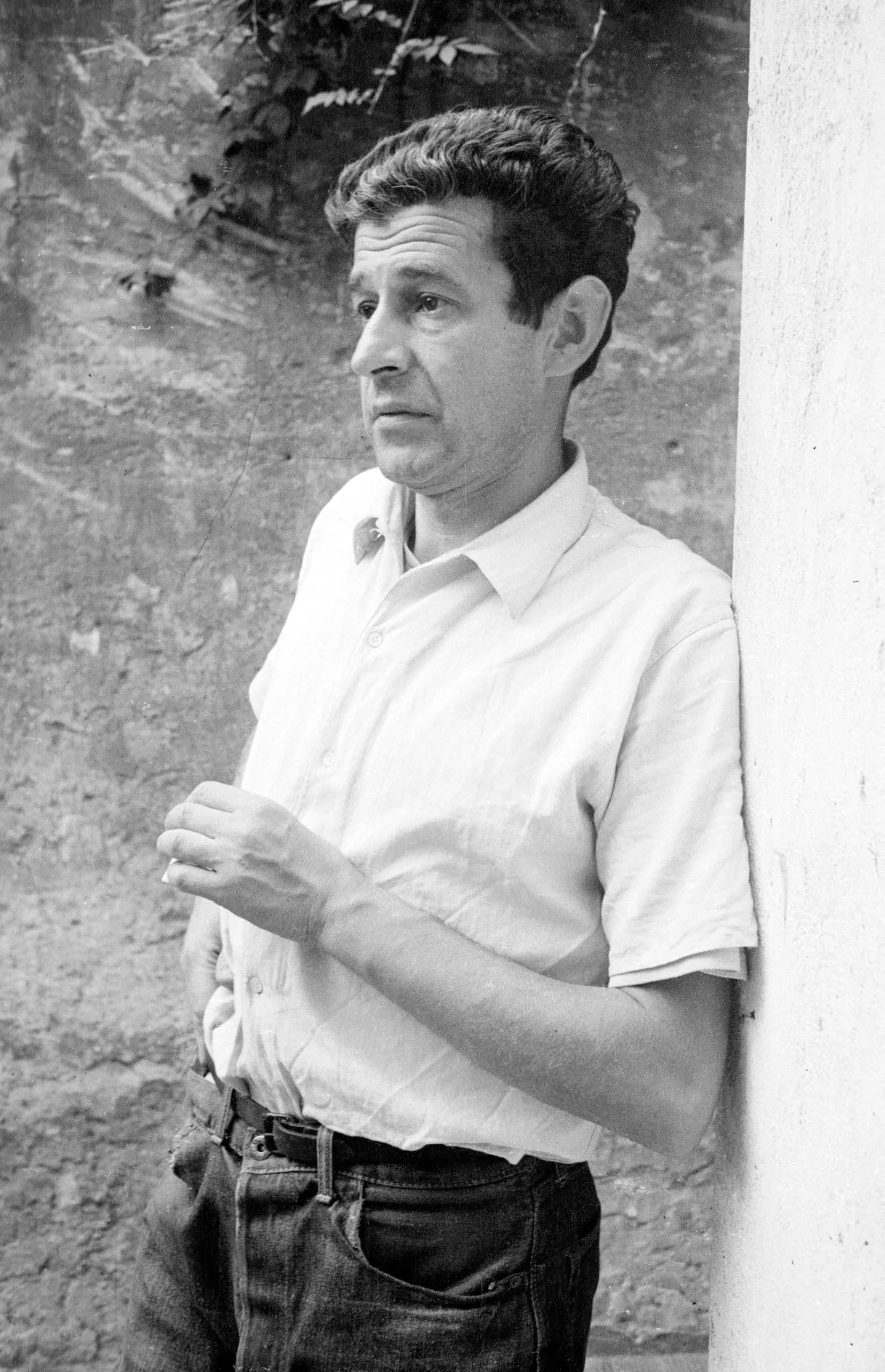 Black and white photograph, man from hips up leaning against a white wall, wearing a short-sleeved collared shirt and dark jeans, looking to the upper left