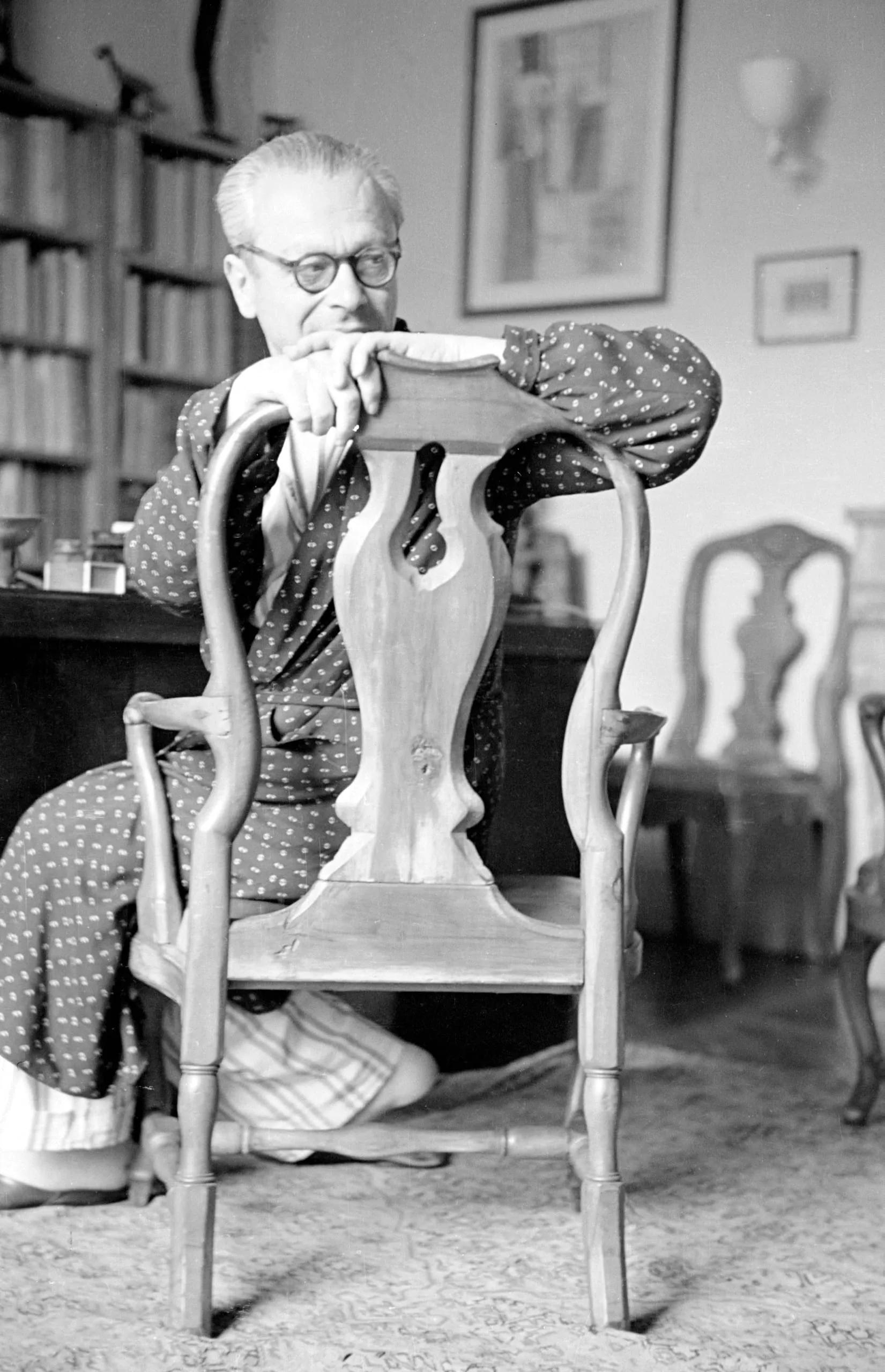 Black and white photograph of a white man in a patterned dressing gown seated behind a wooden chair, leaning on its back rail with chin near folded hands, interior bookshelves visible behind