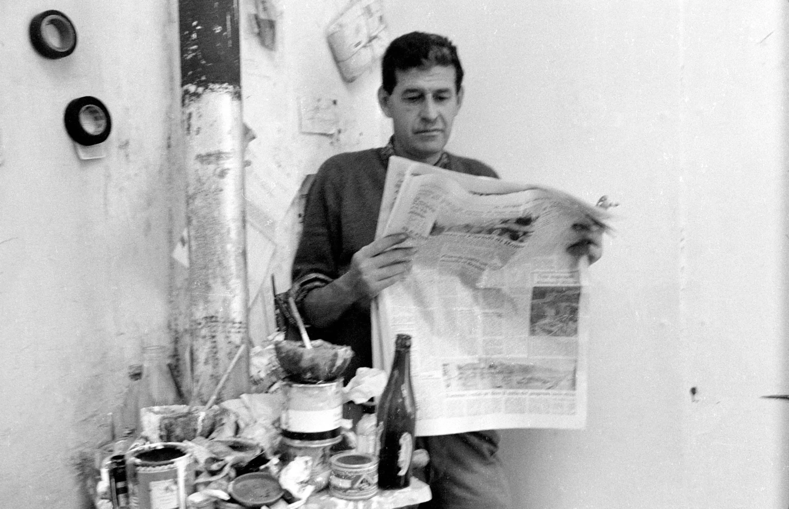 Black and white photograph of a man in a dark sweater and apron reading a broadsheet newspaper, standing beside a paint-covered worktable in a studio