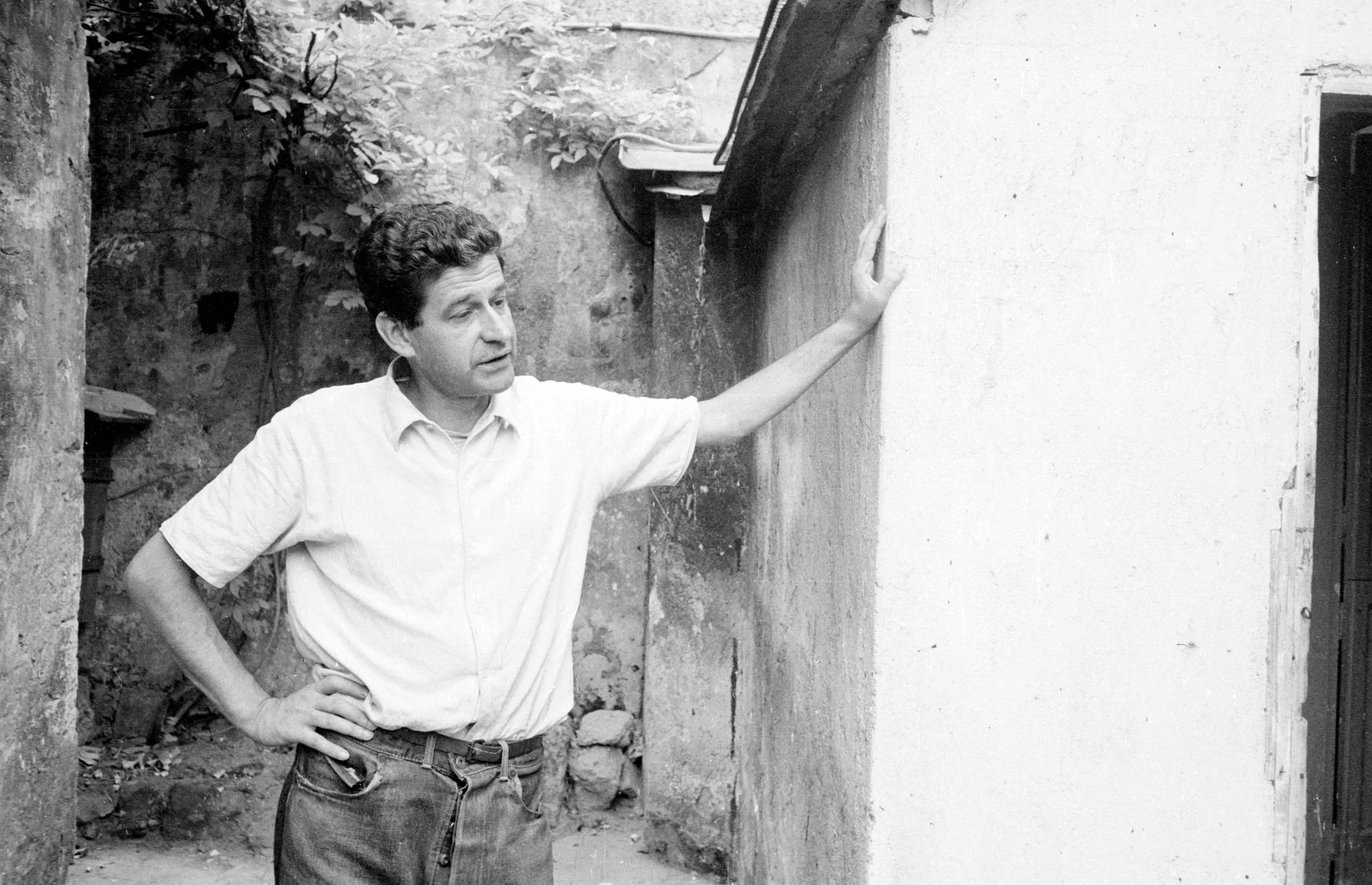 Black and white photograph of a man in a short-sleeved shirt standing between two walls in an outdoor courtyard, one hand resting on a whitewashed surface