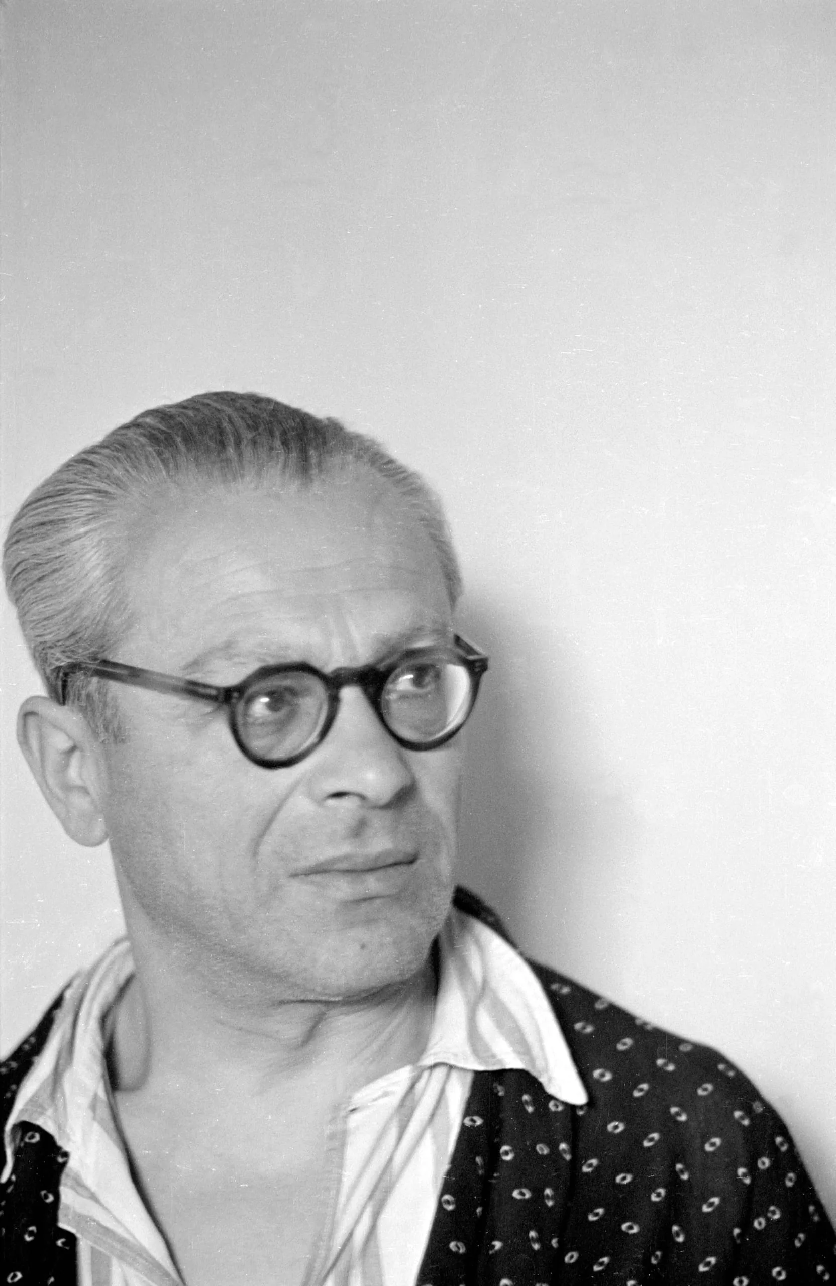 Black and white portrait photograph, chest-up view of a white man with gray hair and round tortoiseshell glasses, looking up and to the right