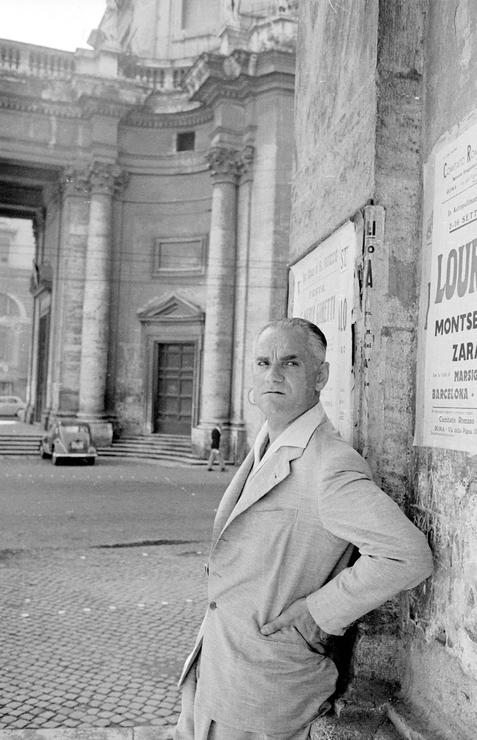 Black and white photograph of a heavyset man in a light suit leaning against a stone wall, a Baroque church colonnade visible in the background