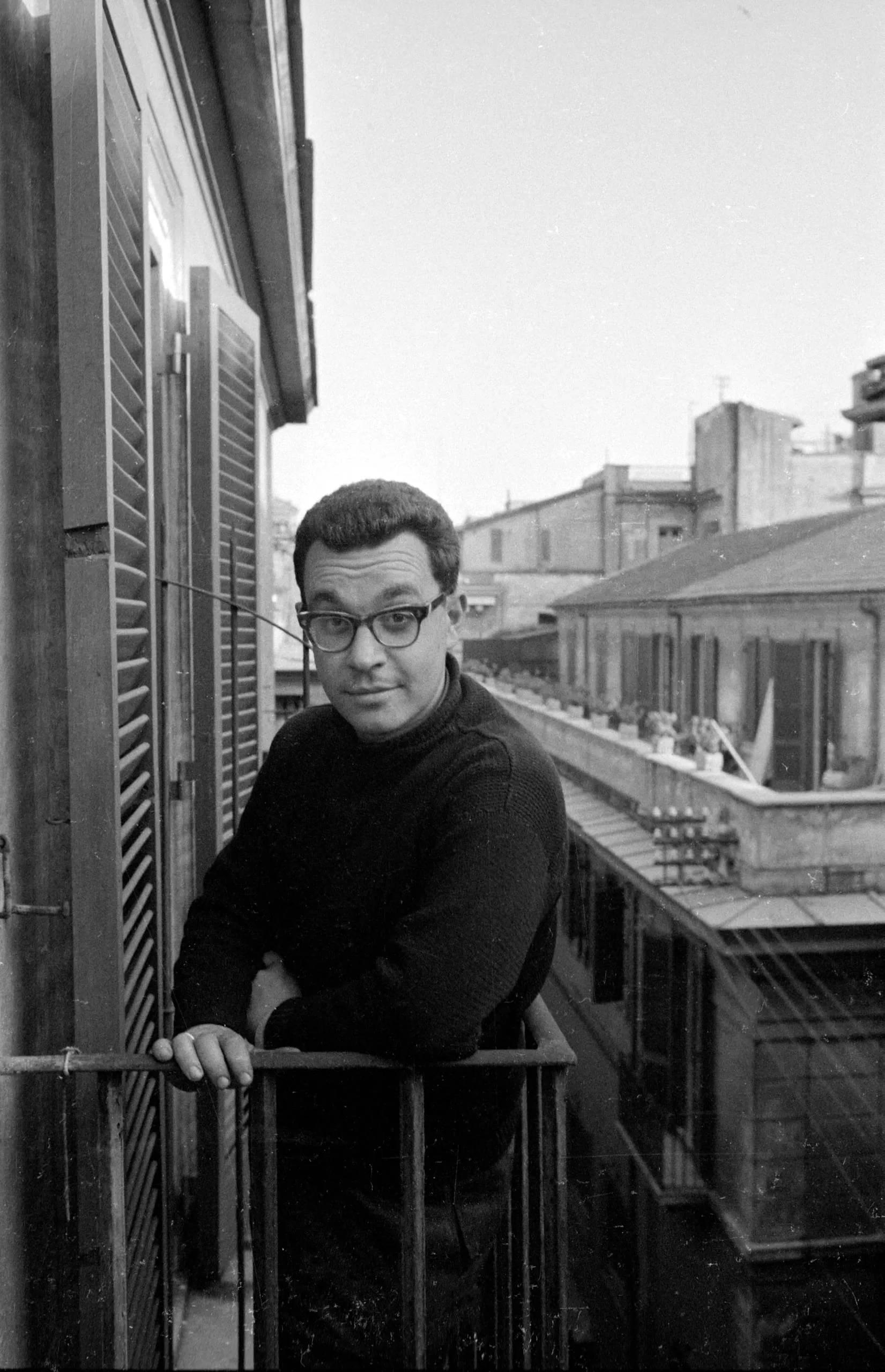 Black and white photograph of a man in a dark turtleneck and thick-framed glasses leaning on a balcony railing, urban rooftops visible behind him