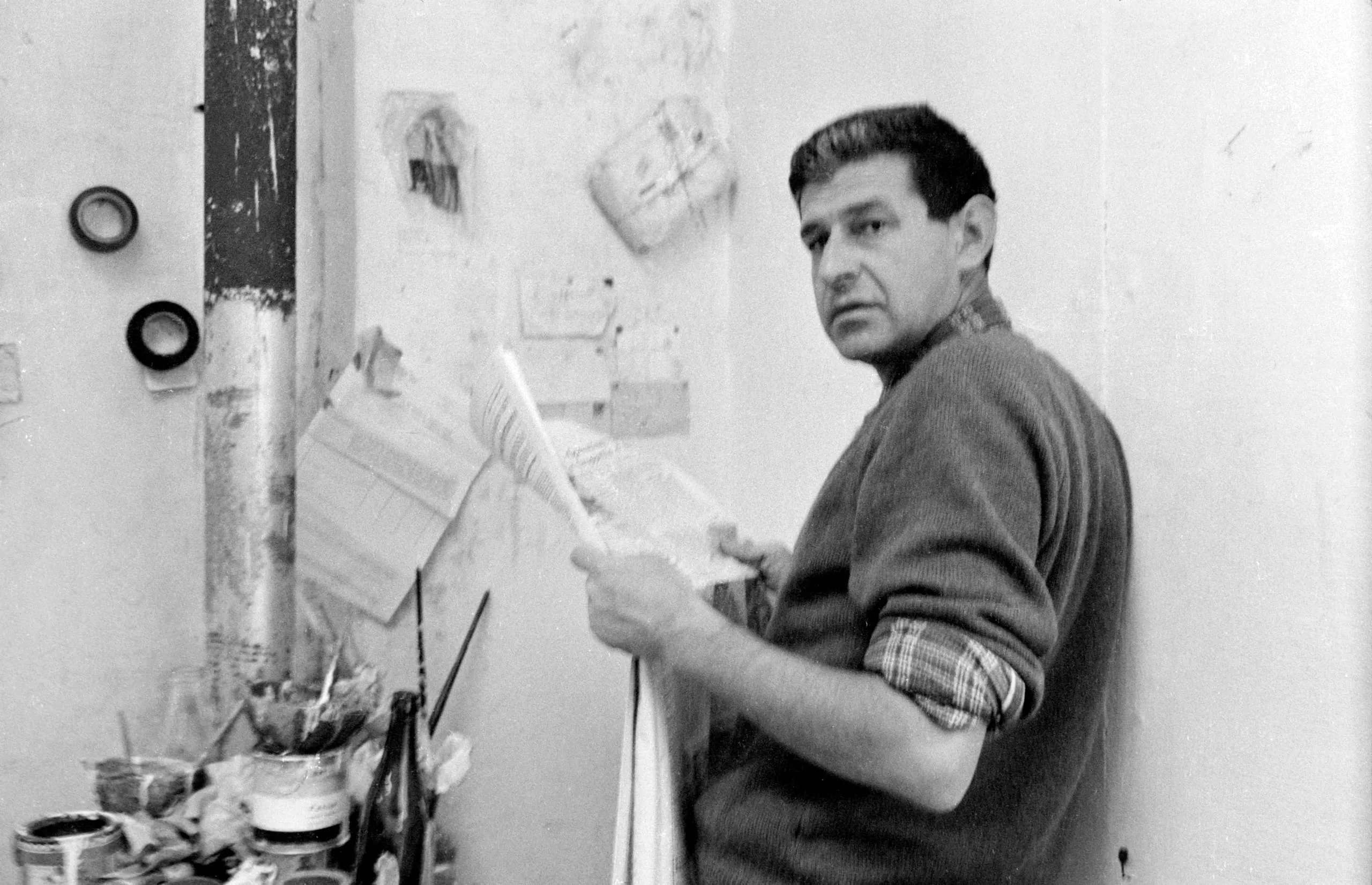 Black and white photograph of a man holding an open newspaper in a cluttered studio, facing the camera directly, soft diffused lighting