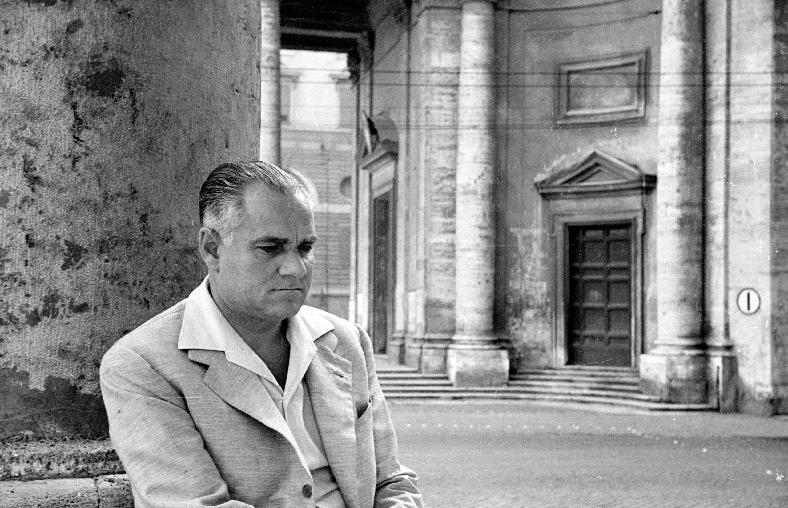 Black and white photograph of a middle-aged man with slicked-back hair, arms folded, seated against a weathered stone column with a classical colonnaded building behind him