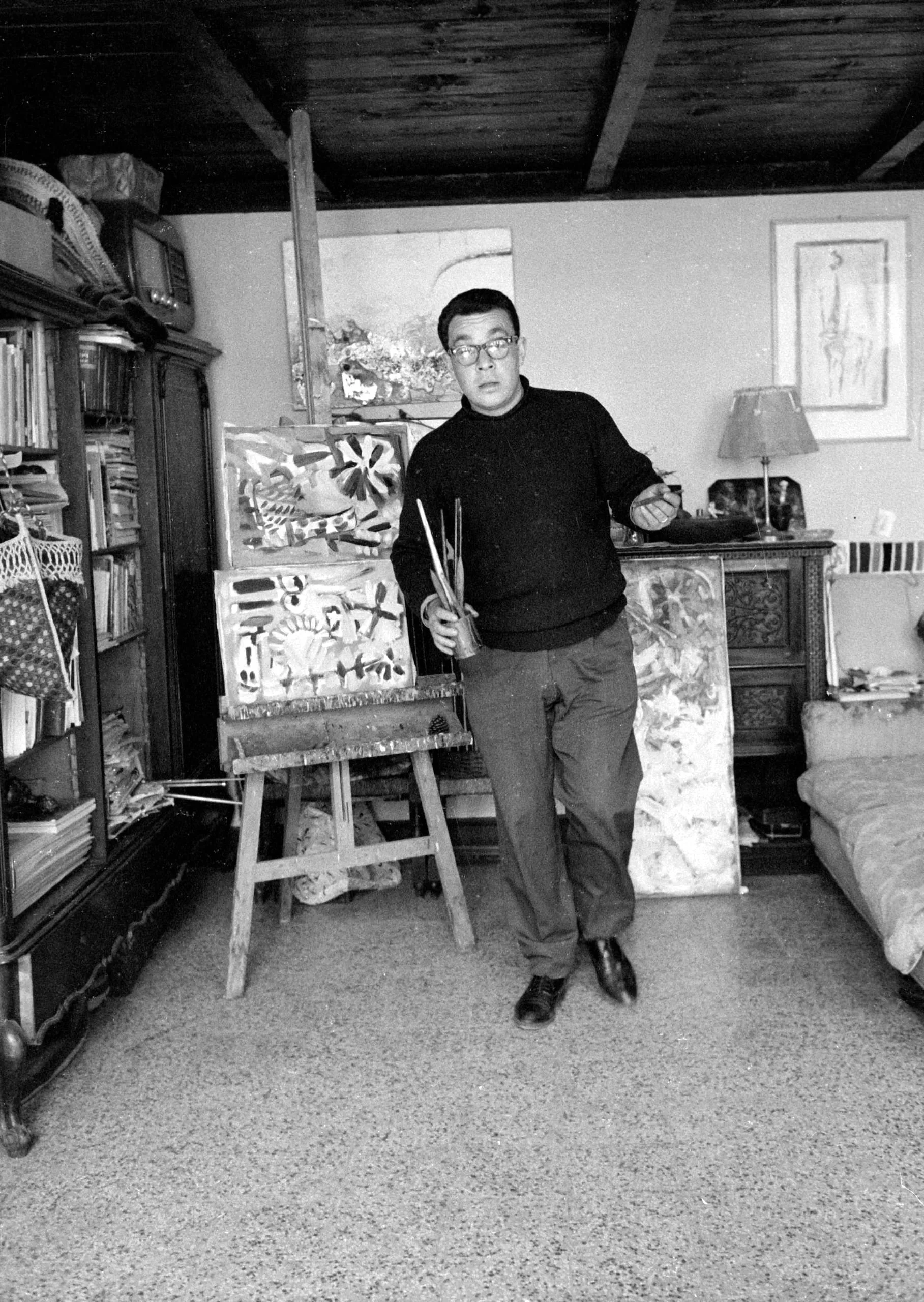 Black and white photograph of a man in glasses and a dark sweater standing full-length in an artist's studio, holding paintbrushes, with a canvas on an easel behind him