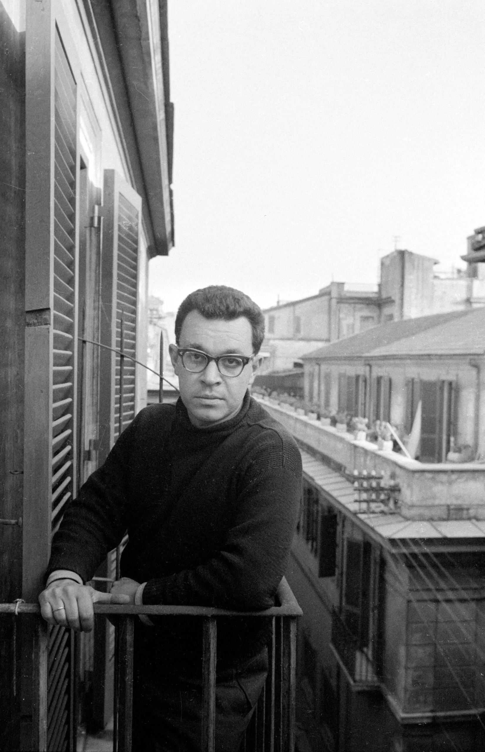 Black and white photograph of a white man in a dark turtleneck and cat-eye glasses leaning on a balcony railing, rooftops visible behind him