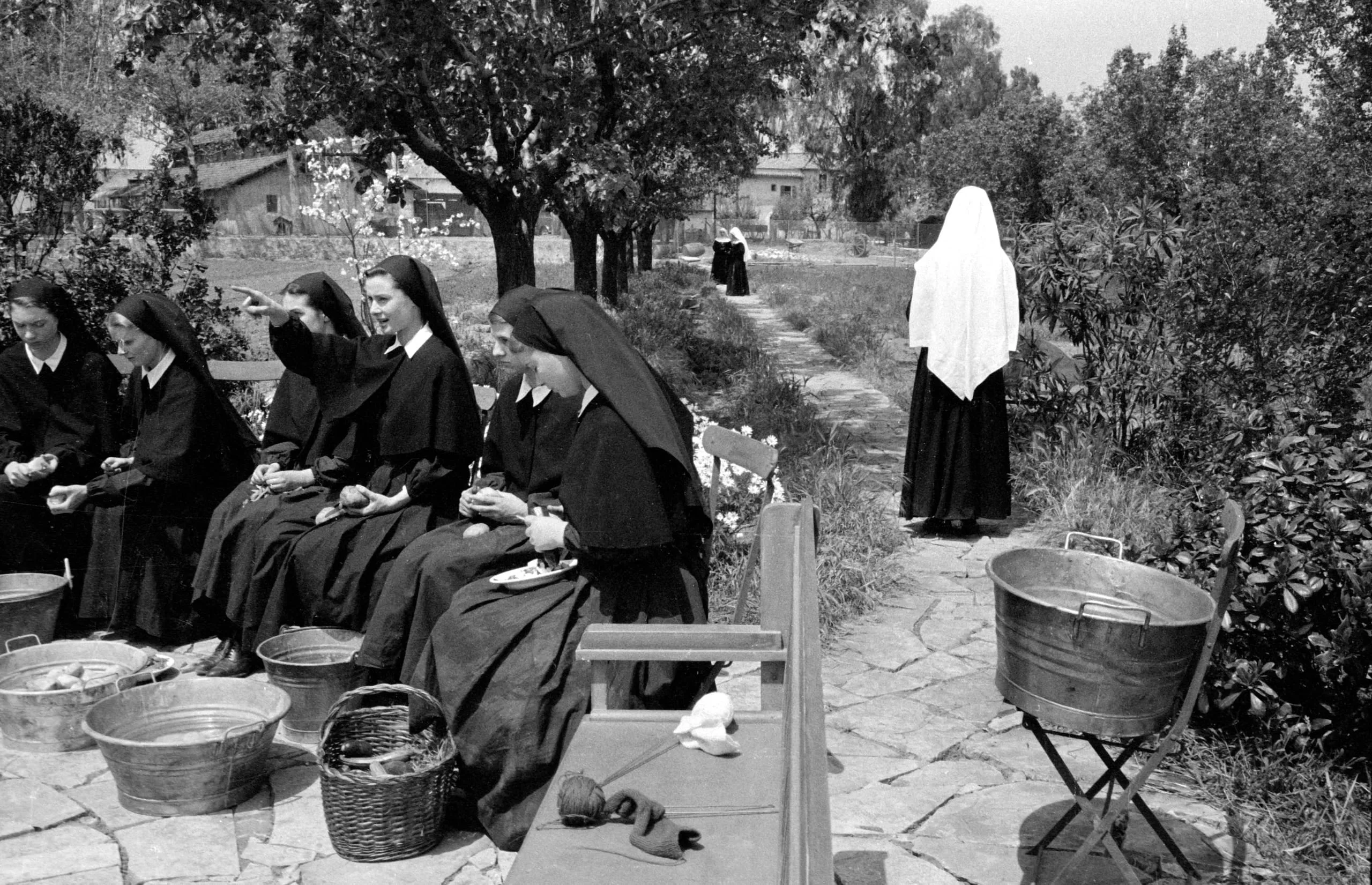 Black and white photograph of a group of women in religious habits seated on a bench doing handwork outdoors, with another figure standing on a garden path, her back to the camera
