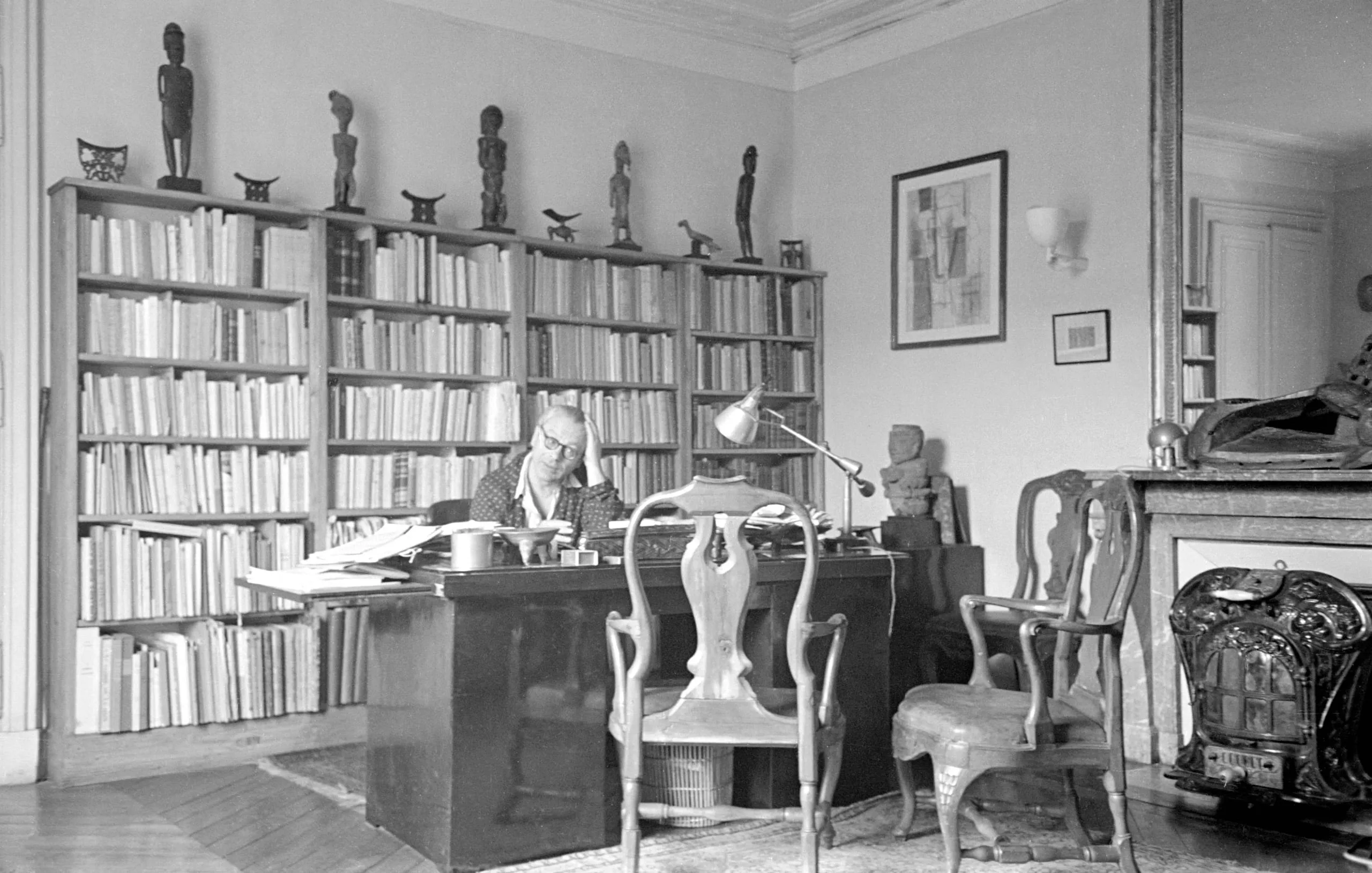 Black and white photograph of a person seated at a large desk in a study lined with floor-to-ceiling bookshelves topped with African carved figurines