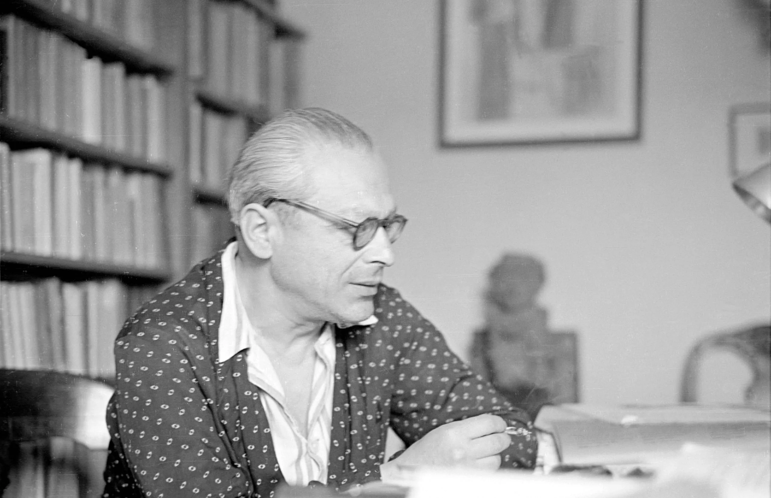 Black and white photograph of a white man in profile, wearing round glasses and a patterned jacket, seated at a desk with bookshelves behind him