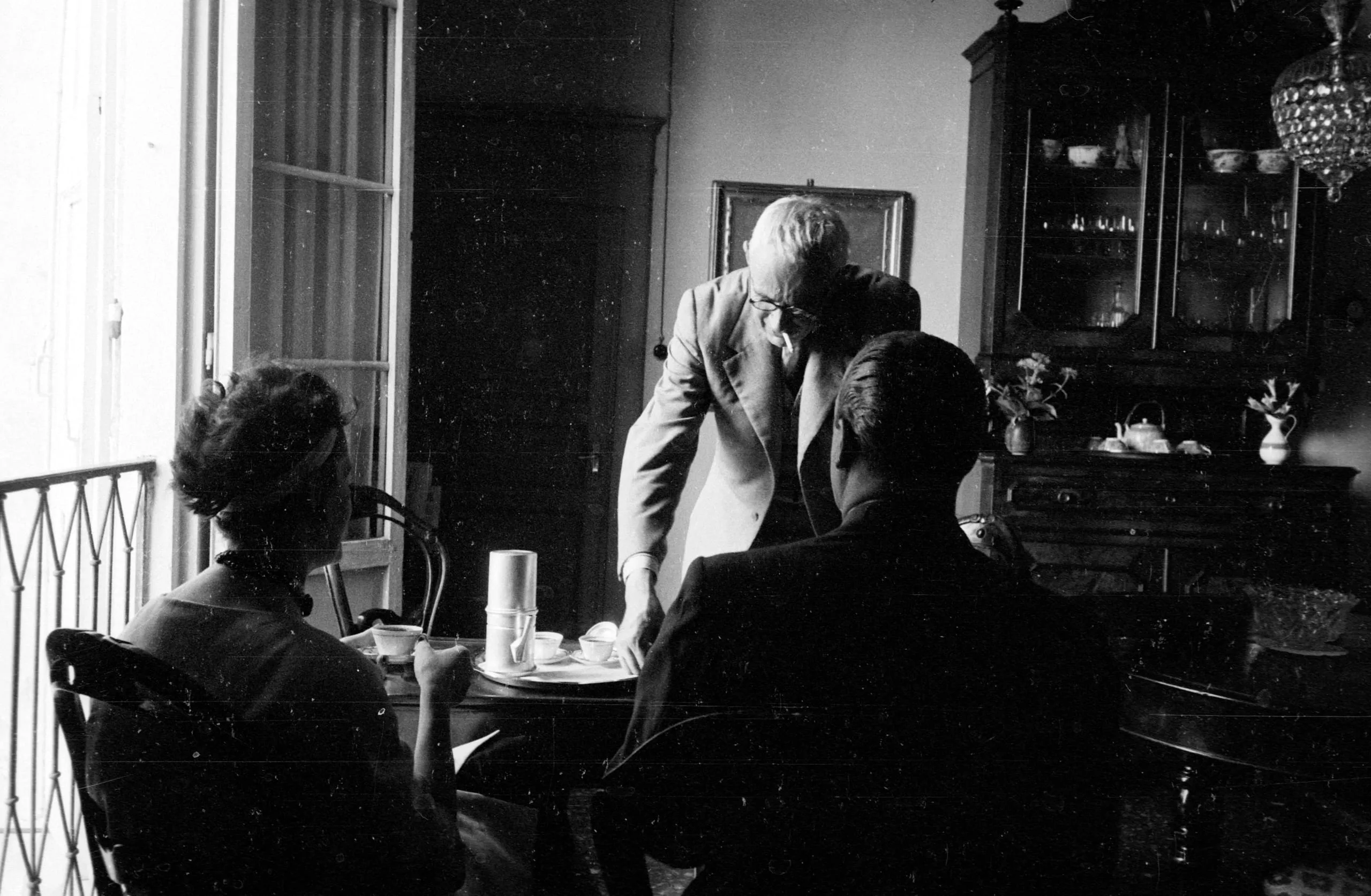 Black and white photograph of three people around a small table indoors, one standing and leaning over, two seated with backs to camera, bright window light on the left