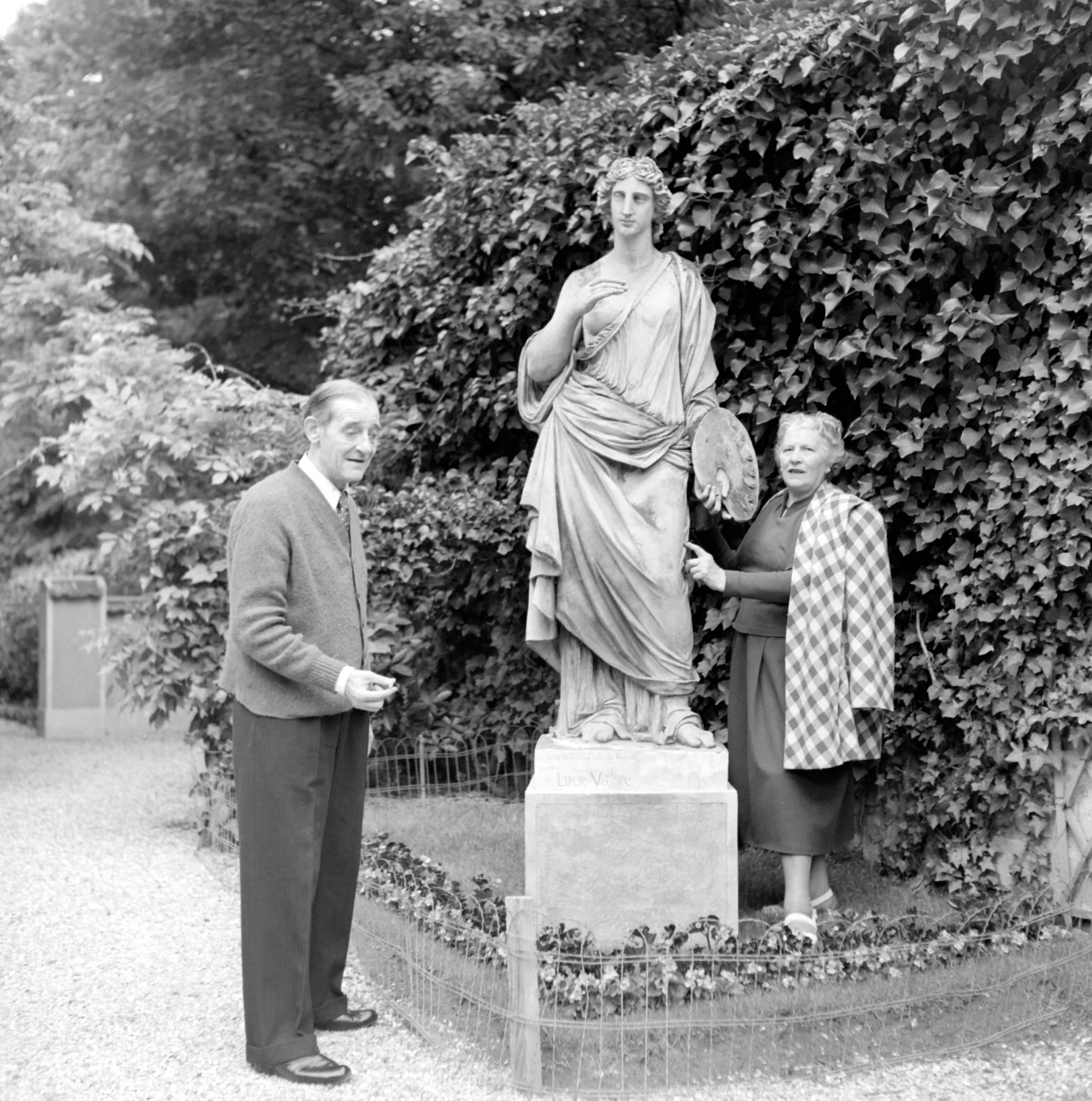 Black and white photograph of two adults flanking a classical draped female statue on a pedestal in a garden, with an ivy-covered hedge behind
