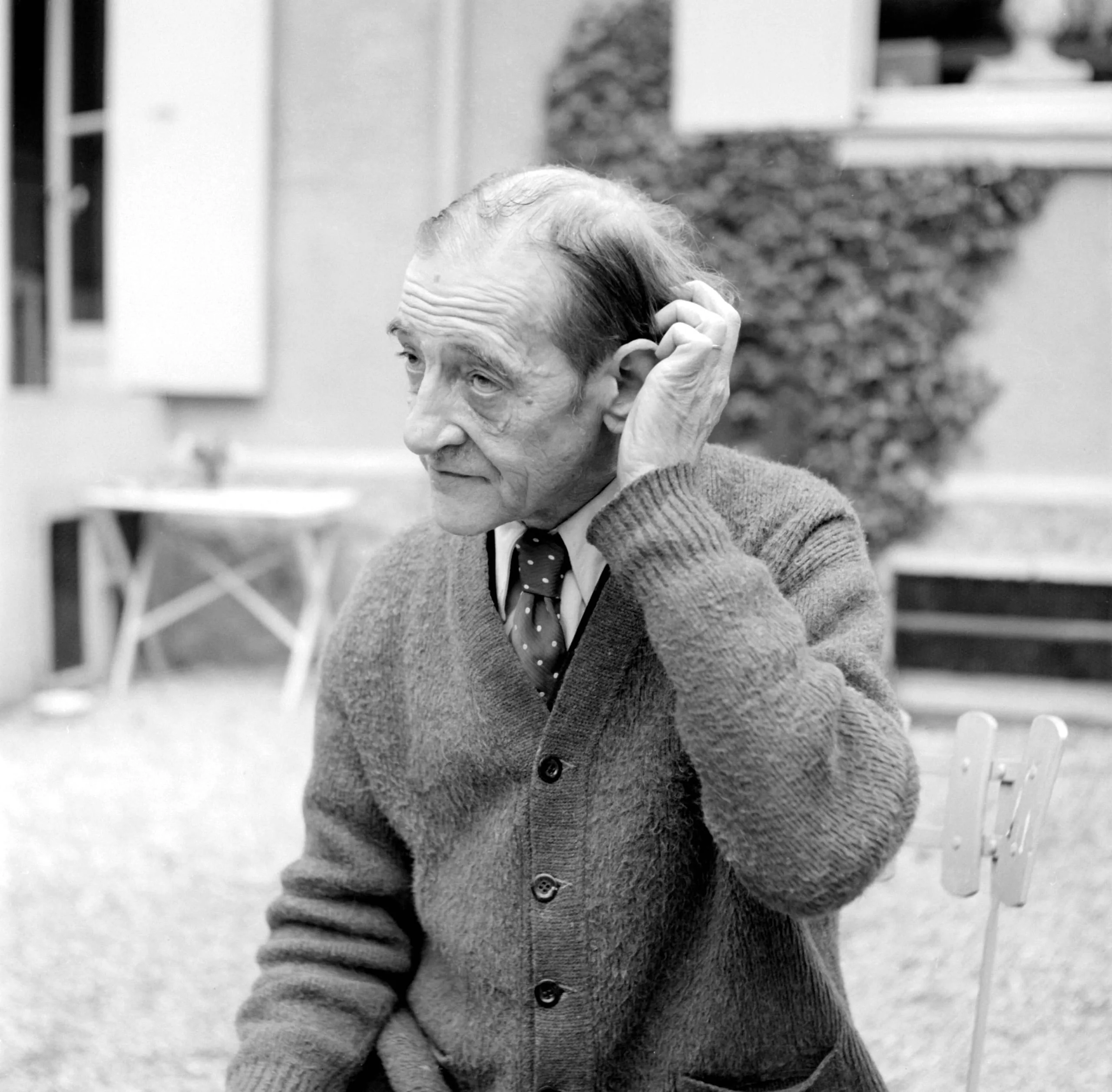 Black and white photograph of an elderly white man seated outdoors, three-quarter view, wearing a cardigan and polka-dot tie, one hand raised to the back of his head, looking to the left