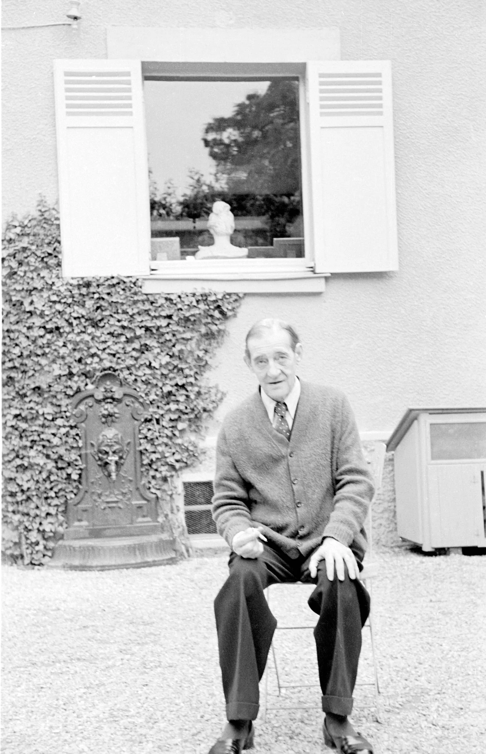Black and white photograph of an elderly man seated on a folding chair outdoors before a stucco building with open shuttered window and ornate wall fountain
