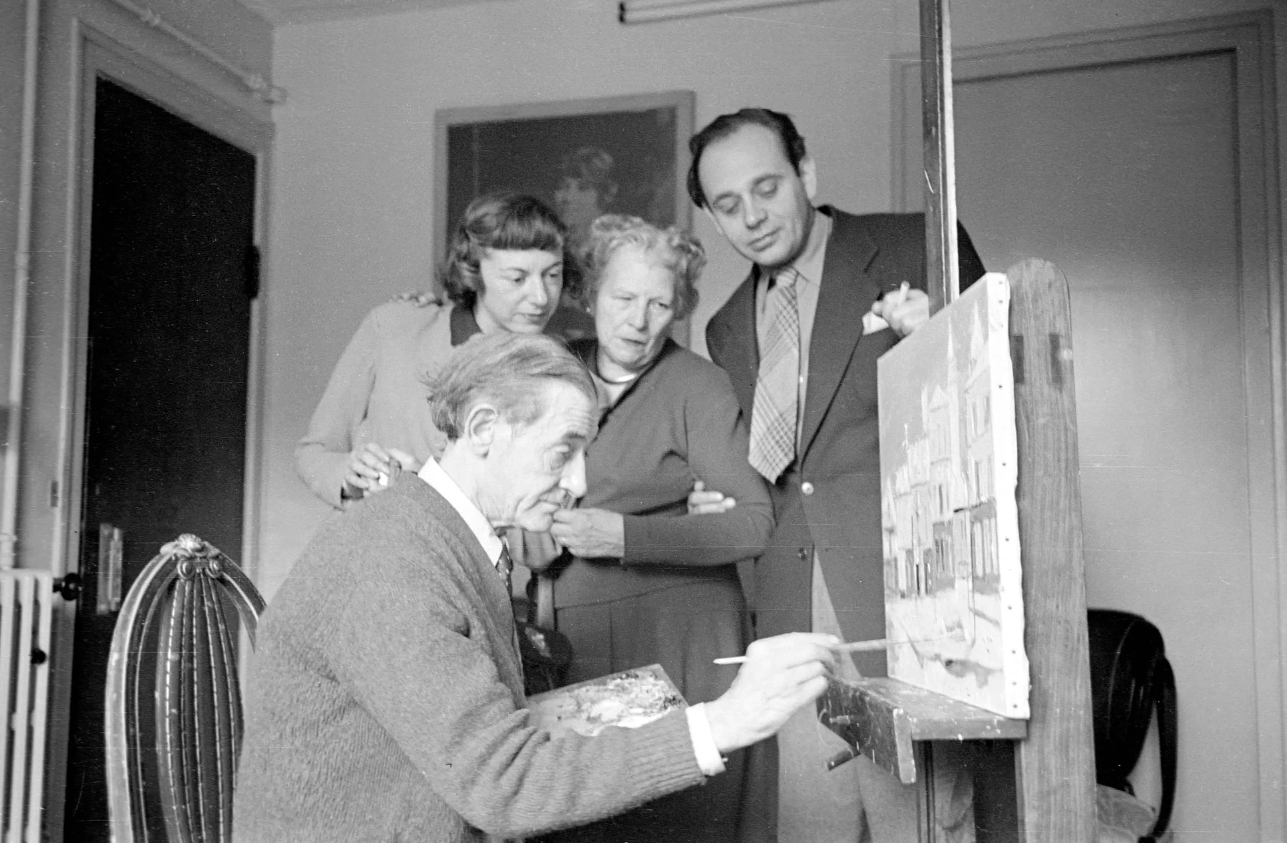 Black and white photograph of four adults gathered around a wooden easel, watching a seated man paint on a small canvas