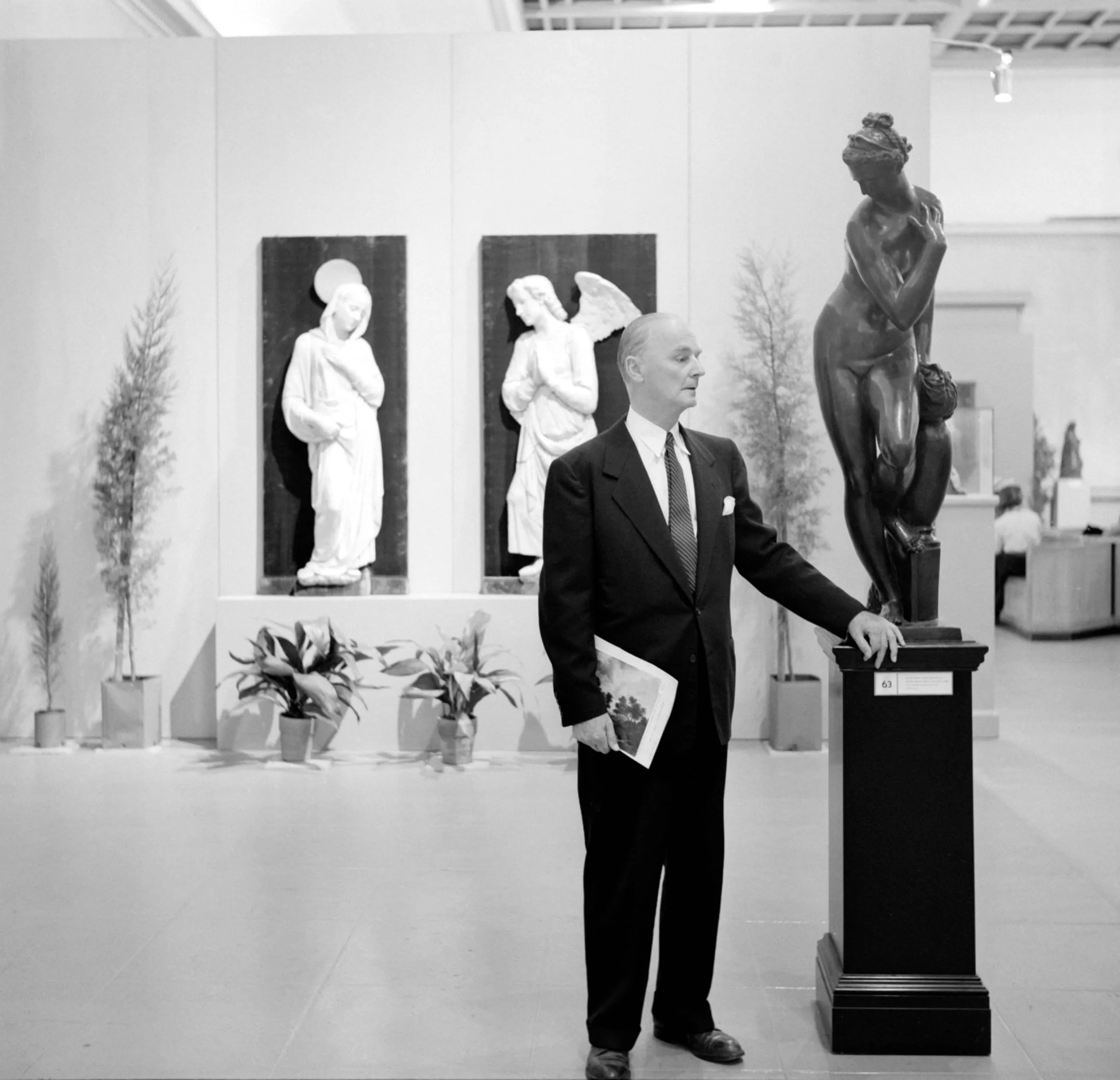 Black and white photograph of a man in a dark suit standing in a gallery, one hand resting on a tall pedestal supporting a bronze nude figure, with white angel sculptures on dark panels behind him
